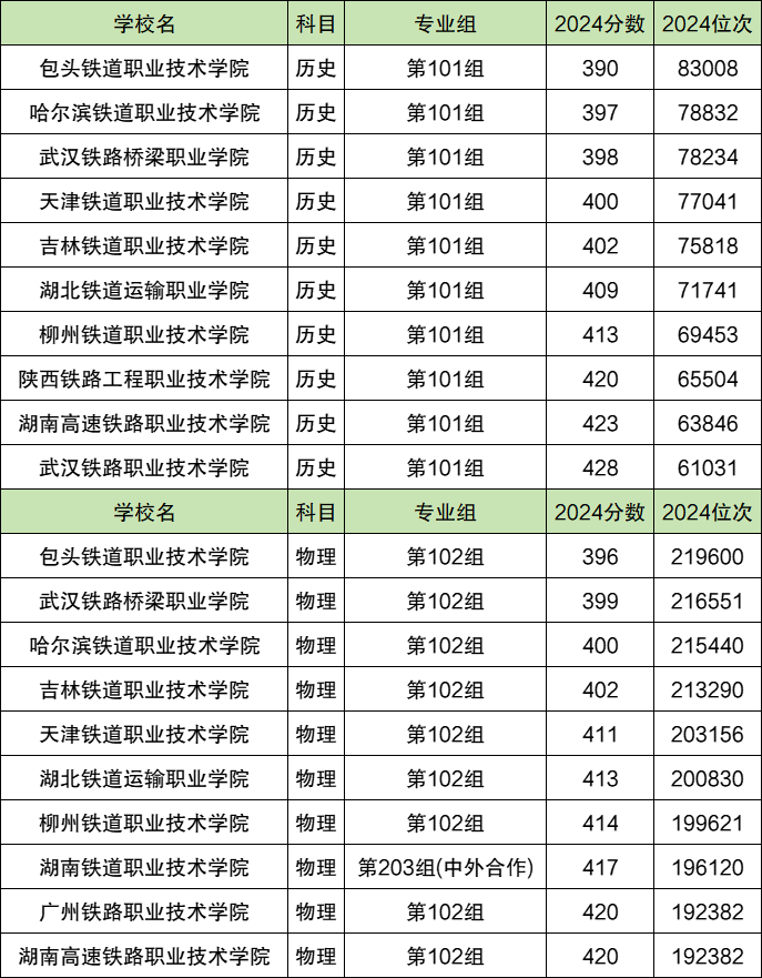 2024年湖南铁路专科大学最低分数线历史组是390分,物理组是396分,对比湖南当年专科线可发现:首选历史科目的考生最低超过专科线190分即可、首选物理科目的考生最低超过专科线196分即可有机会上铁路专科大学。