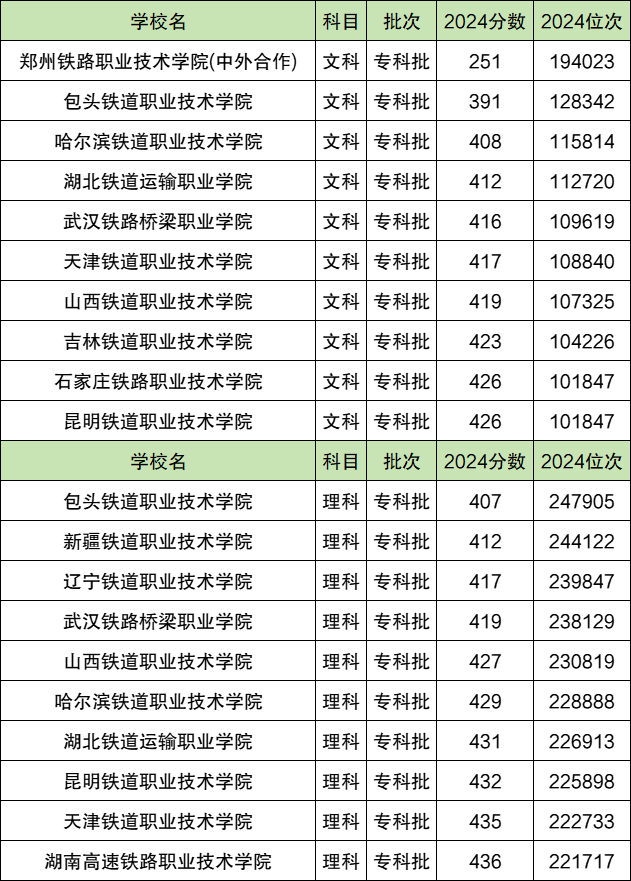 二、铁路专科大学2024录取分数线多少