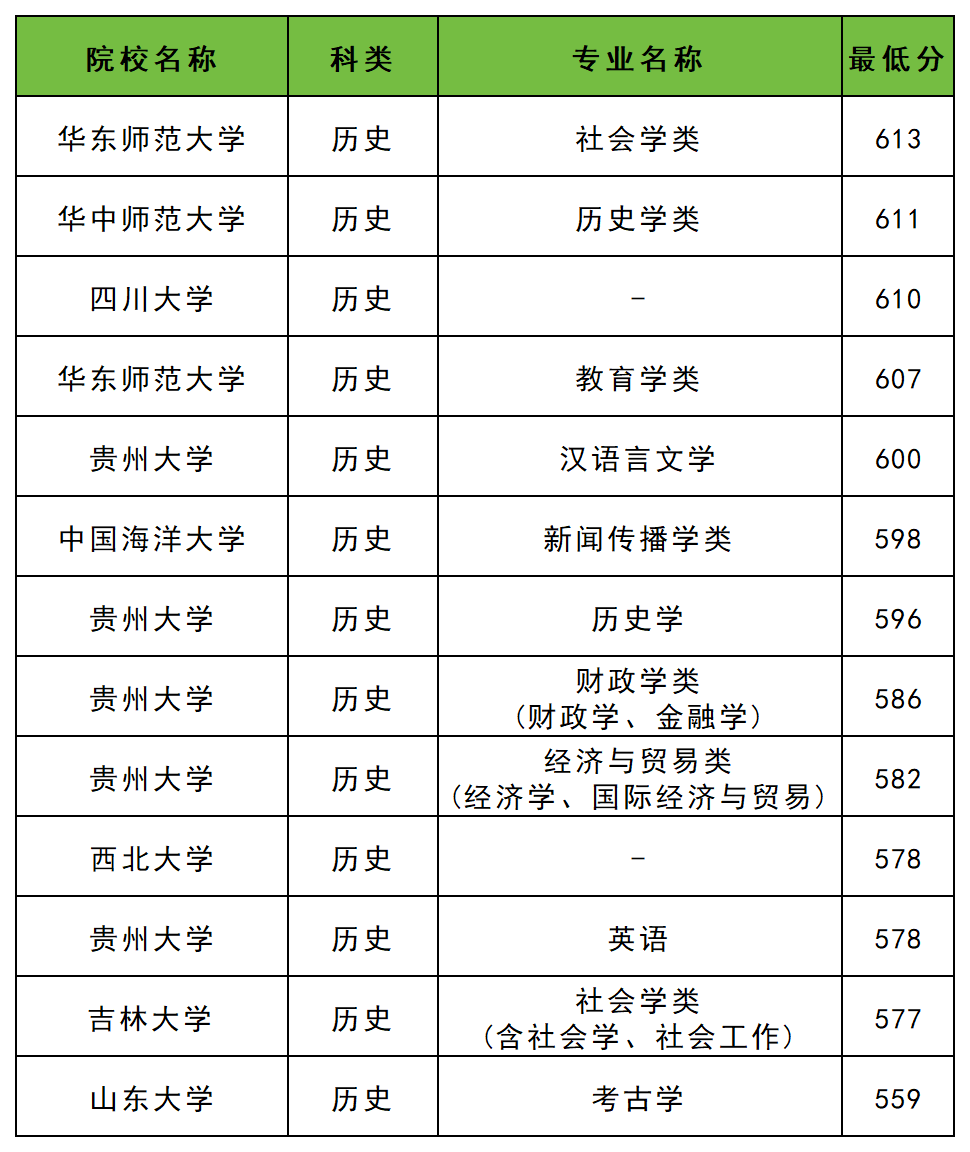 贵州大学:汉语言文学600分、历史学596分、财政学类(财政学、金融学)586分、经济与贸易类(经济学、国际经济与贸易)582分、英语578分;