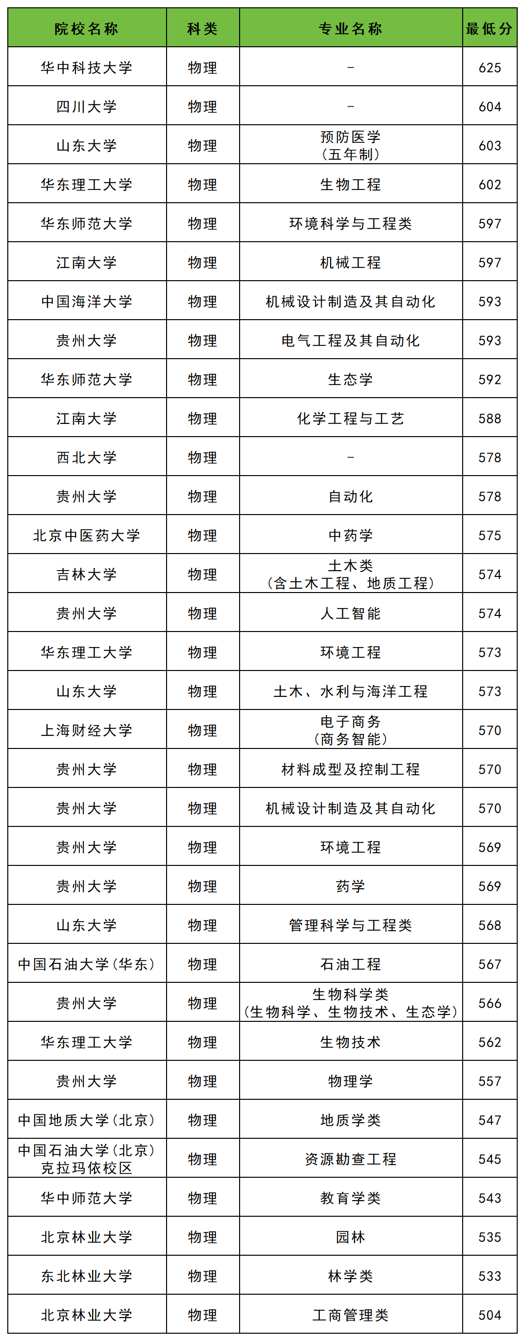 2025年贵州高校专项物理类录取分数线位于504分到625分之间,收分最低的是北京林业大学工商管理类专业,收分最高的是华中科技大学,各校各专业具体分数线如下。