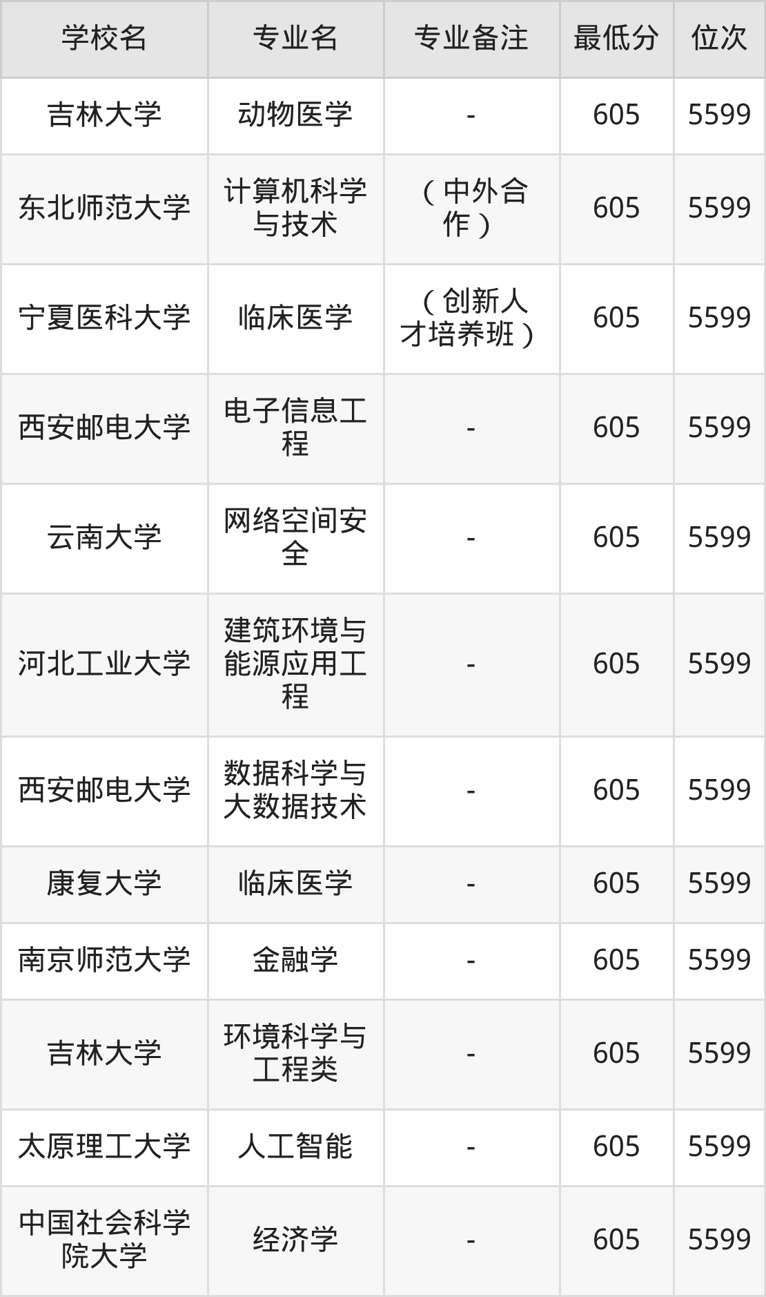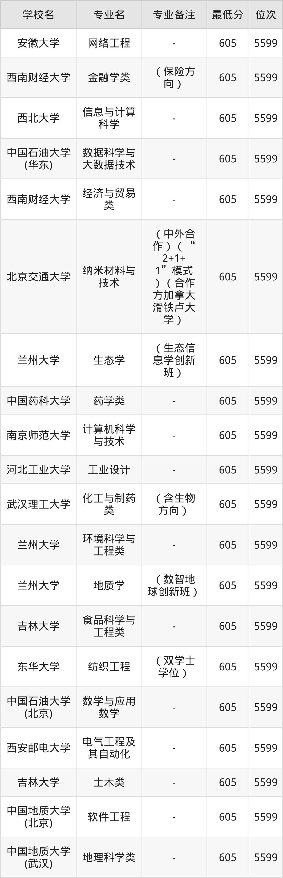 为让同学们可以有很多可选择的院校,除上述已经列举的名单外,下面还展示了2025年内蒙古物化生605分左右(604分-606分)的部分大学名单一览表,供参考,注意学校不同分数对应专业有差异: