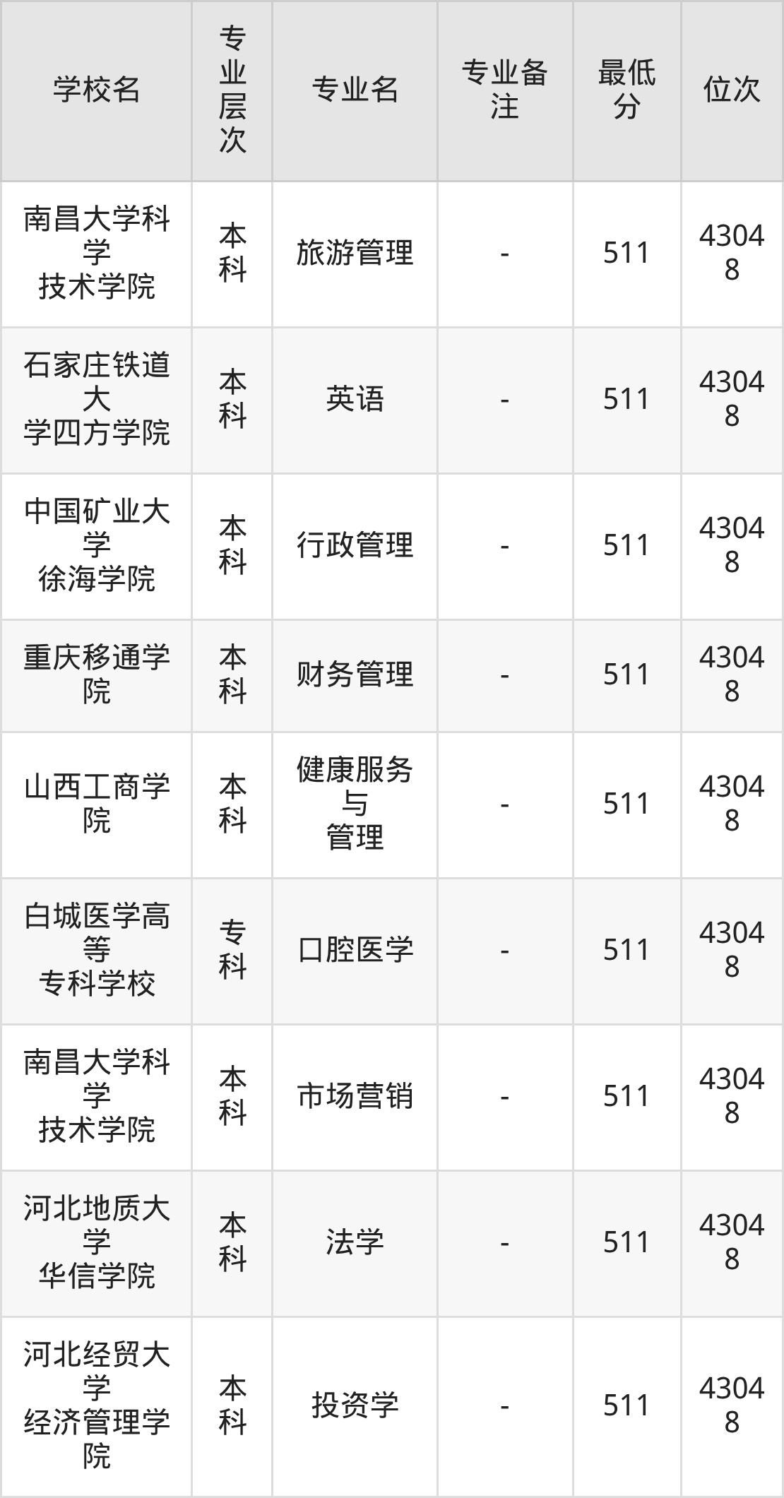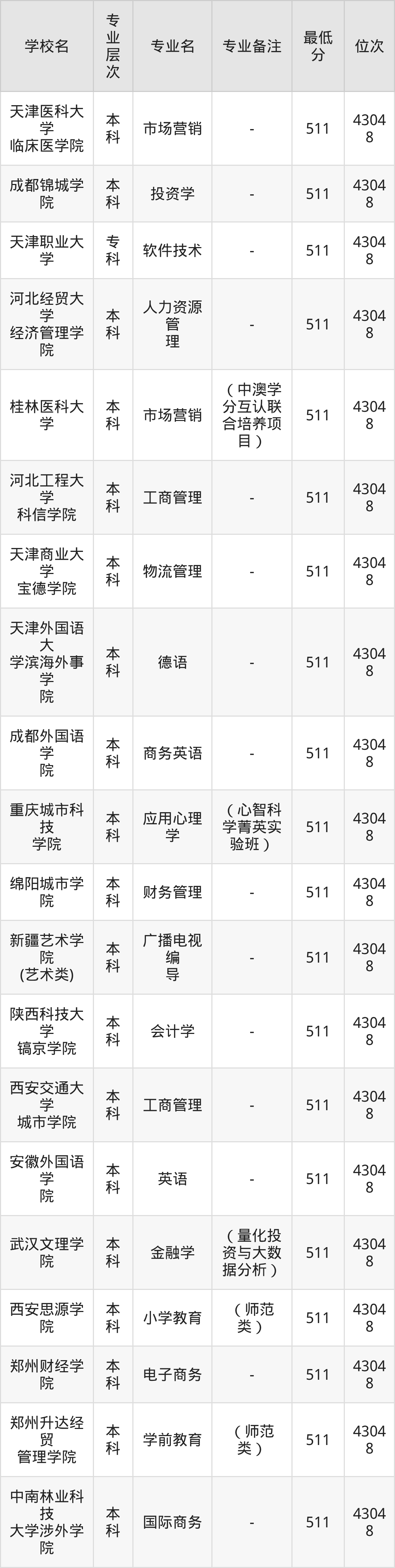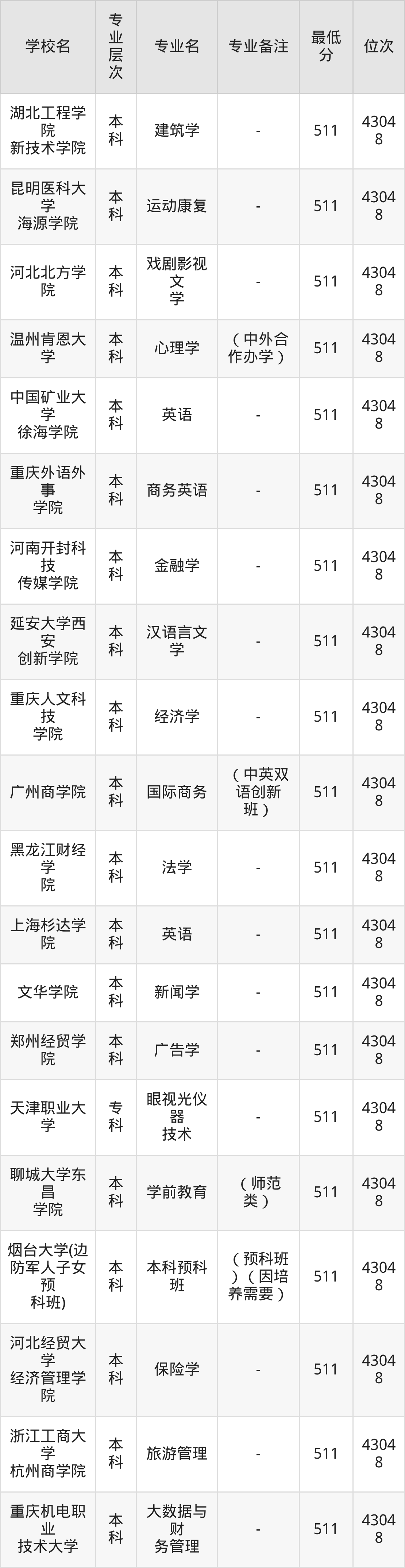 为让同学们可以有很多可选择的院校,除上述已经列举的名单外,下面还展示了2025年河北历政地511分左右(510分-512分)的部分大学名单一览表,供参考,注意学校不同分数对应专业有差异: