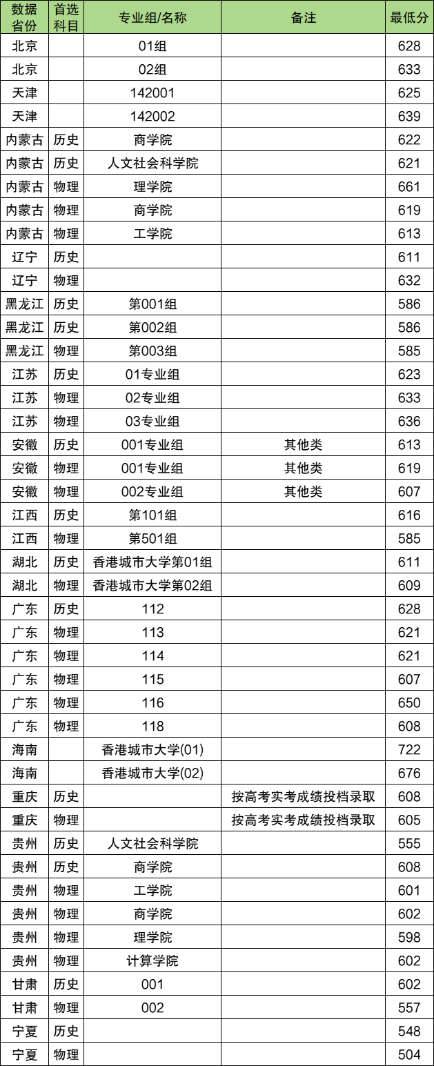 2025年香港城市大学录取分数线是504分到722分,多数地区需要550分以上才能被录取,在宁夏、甘肃、黑龙江等地收分较低;广东、天津、江苏、北京等地的考生一般需要620分左右才能考上。各省最低分一览表如下: