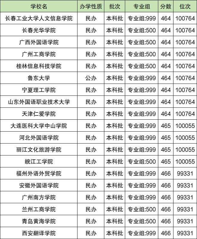 10万名左右最高位次对应的院校是兰州工商学院、青岛黄海学院、西安翻译学院,最低录取位次为99331位以,位次对应分数为466分;