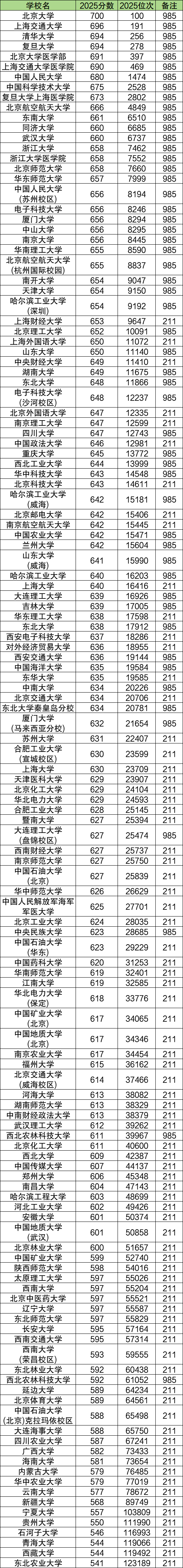 2025年985和211大学在浙江招生录取分数线从541分到700分不等。