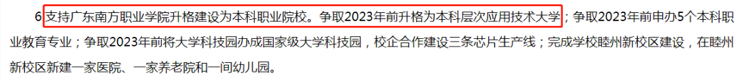 支持广东南方职业学院升格建设为本科职业院校。争取2023年前升格为本科层次应用技术大学;争取2023年前申办5个本科职业教育专业。