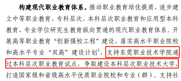 文件指出:支持东莞职业技术学院通过本科层次职业教育试点,争取建设本科层次职业技术大学。