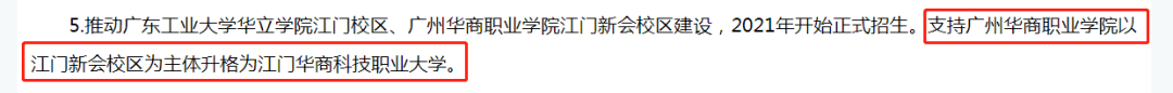 推动广东工业大学华立学院江门校区、广州华商职业学院江门新会校区建设,2021年开始正式招生。支持广州华商职业学院以江门新会校区为主体升格为江门华商科技职业大学。