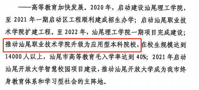 文件指出:推动汕尾职业技术学院升级为应用型本科院校,在校生规模达到14000人以上。