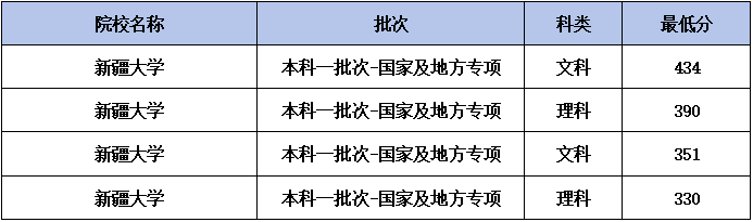 在新疆文科招生的地方专项计划院校有新疆大学等1所,录取分数线最低是351分。