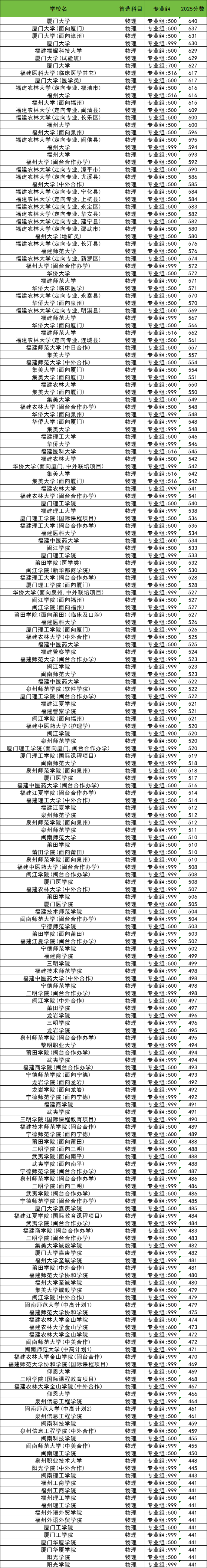 二、2025福建各高校物理类录取分数线一览表