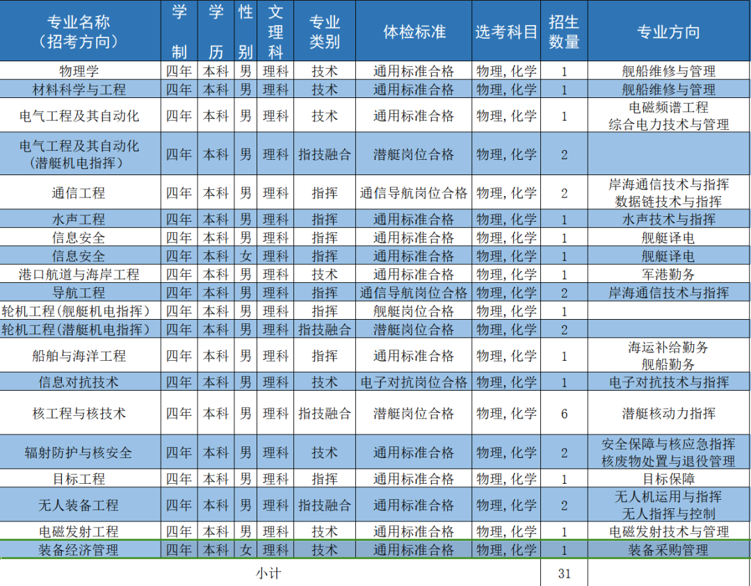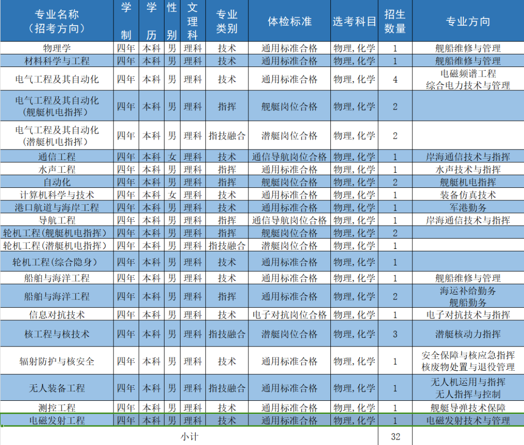 潜艇机电指挥——培养从事海军常规潜艇机电系统和核潜艇电气系统设计制造、机电指挥、使用管理、技术保障等的初级军官。主要课程有电机学、自动控制原理、电力电子技术、潜艇电气设备、潜艇电力推进、潜艇操纵、潜艇辅助机械、潜艇装置与系统等。
