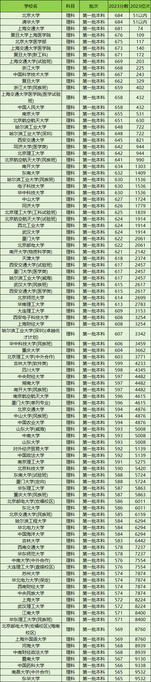 2023年全国一共有106所211大学理科招生,其中位次排名最高的5所分别是:清华大学684分(位次51以内)、北京大学684分(位次51以内)、上海交通大学681分(位次74)、复旦大学上海医学院676分(位次109)、北京大学医学部675分(位次117)。这5所录取分数线最高,是理科考生最值得上、最好的211大学。