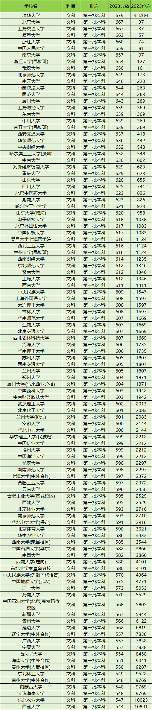 部分211大学分数线文科榜单一览: