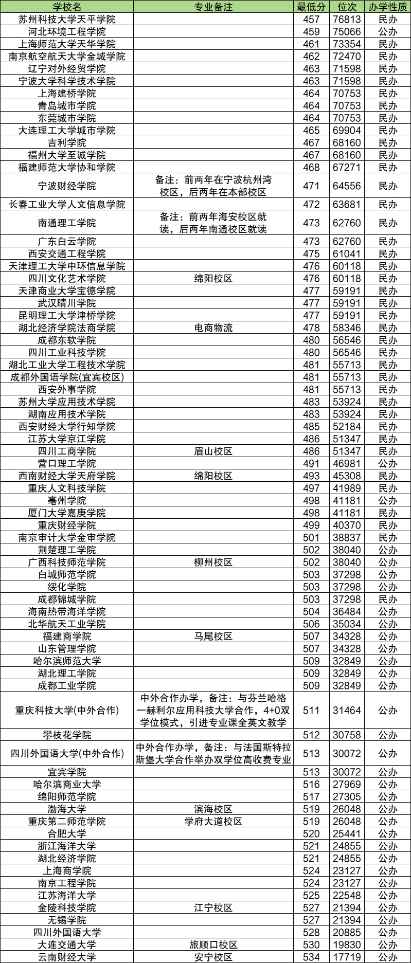 二本物流管理分数线排名前五的还有:大连交通大学530分、四川外国语大学528分、无锡学院527分、金陵科技学院527分。分数线最高的民办二本物流管理大学为成都锦城学院,2024年最低分503分。