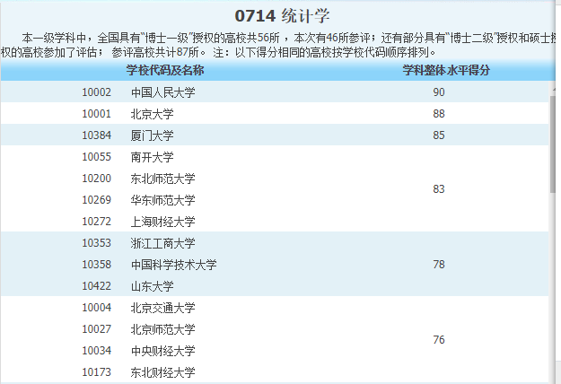 然后来看看统计学,入选名单包括北大、人大、南大、东北师大、华东师大、上海财大、厦大等学校。其学科水平得分也比东财高得多,没有入选很正常。并且这些院校不管在单一学科实力,还是学校综合实力上,都远远超过东财。