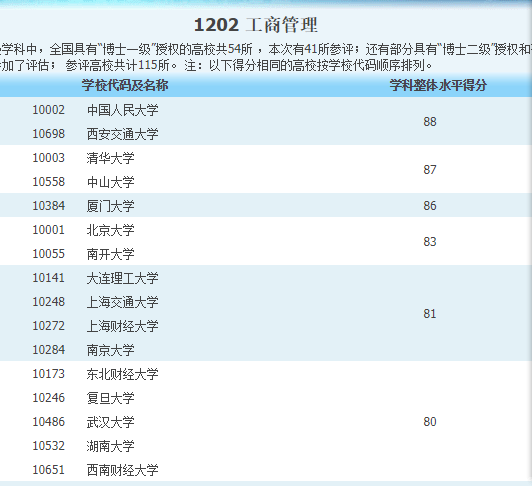 其中工商管理学入选一流学科的大学包括:清华大学、中国人民大学、中山大学、西安交通大学,这四所大学的学科整体水平得分相当高,而东财的工商管理得分为80分,该学科没有成功入选是合理的。