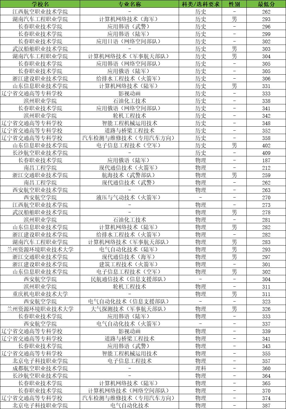 而士官学校在吉林历史类的最低录取分数线则是262分,因此吉林历史类考生最低262分可以上士官学校。