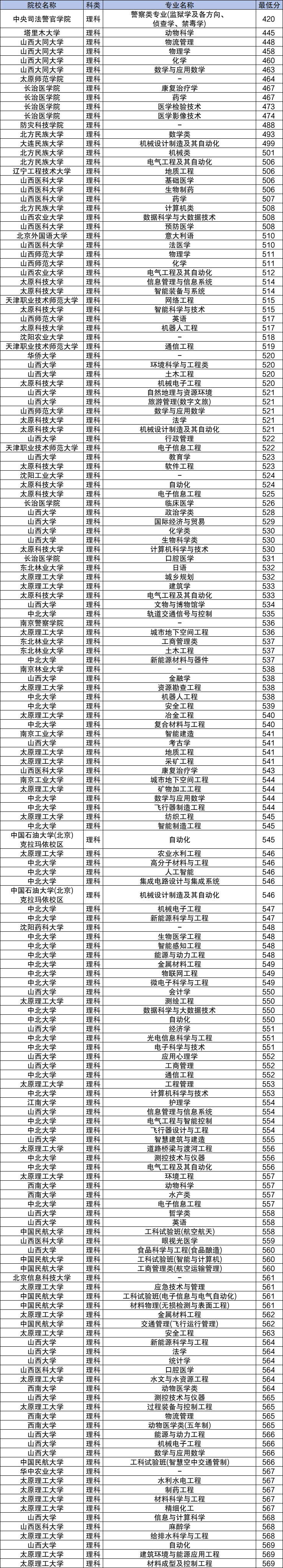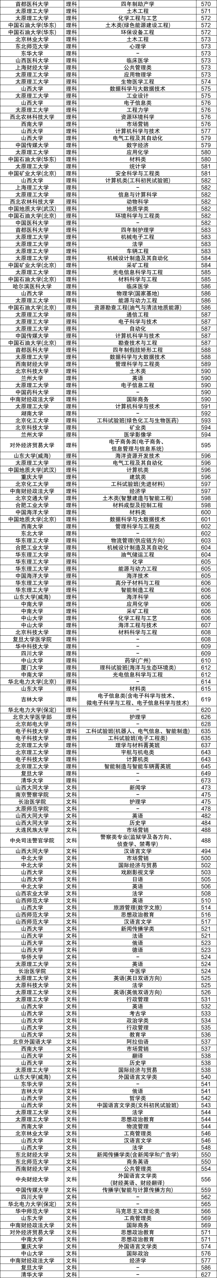 理科收分最低的是吕梁学院(物理学(师范类)、土木工程、采矿工程);文科收分最低的是太原工业学院(国际经济与贸易、跨境电子商务)。