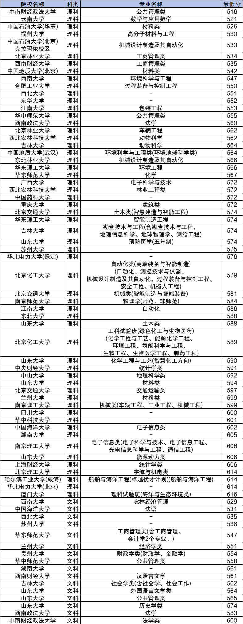 理科收分最低的是中南财经政法大学(公共管理类);文科收分最低的是西南大学(农林经济管理)。另外山西高校专项计划录取分数线最高的大学:文科为中南财经政法大学(法学类)(600分);理科为厦门大学(理科试验班(海洋与生态环境类))(616分)。