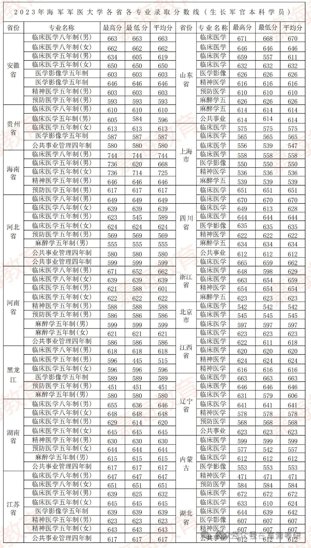 篇幅有限,以下是海军军医大学2023年在各省提前批招生录取最低分情况,供参考: