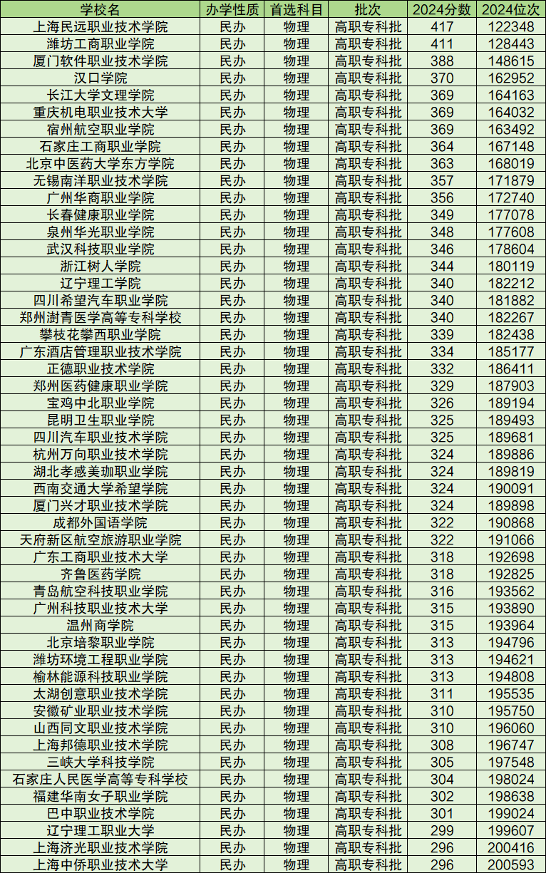 2024年民办专科大学录取分数线从181分到417分不等,其中收分最高的是上海民远职业技术学院,收分最低的有贵州铜仁数据职业学院、江西新能源科技职业学院。