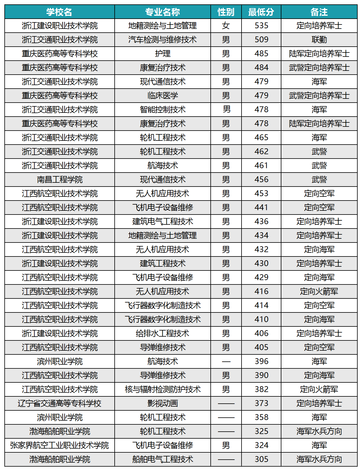 2023年浙江交通职业技术学院、南昌工程学院、江西航空职业技术学院、滨州职业学院等学校面向浙江定向士官招生。以下为已公布2023年浙江定向士官学校的分数线汇总。