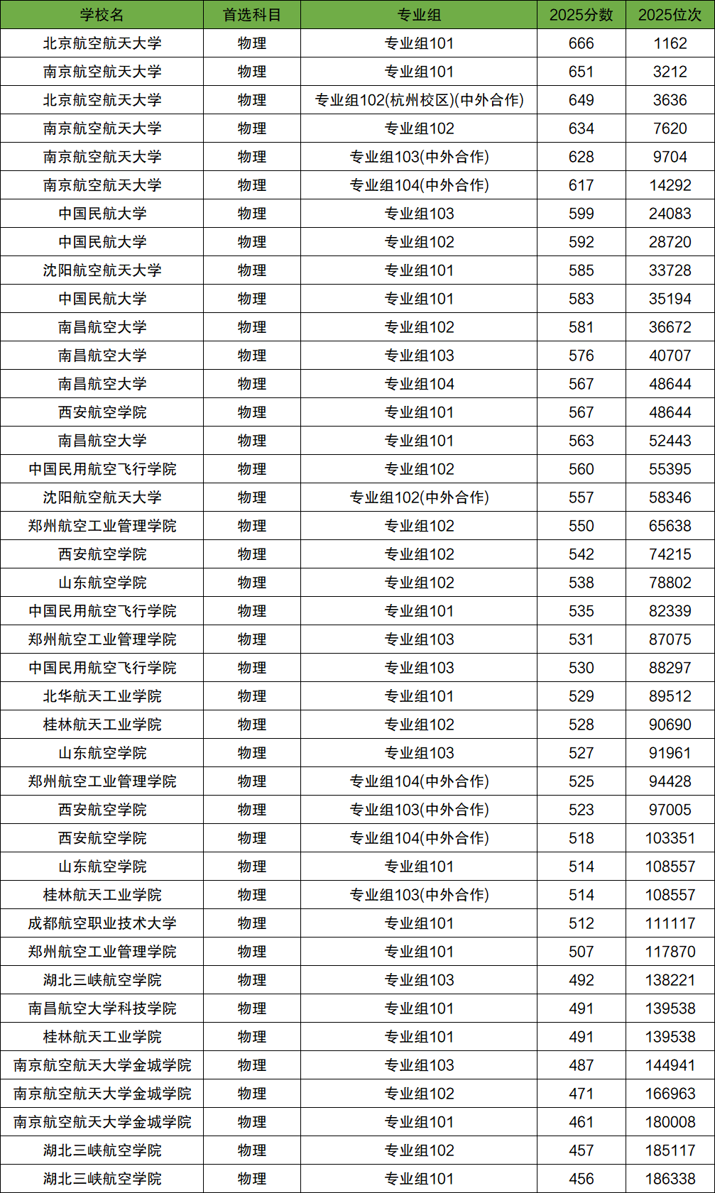 下面是2025全国航空航天院校在四川物理类招生的录取分数线一览表