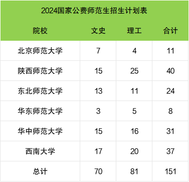 表格数据显示,共计招生151人,其中理工类81人,文史类70人。华东师范大学招生数量最少,为8人;陕西师范大学招生数量最多,为40人。