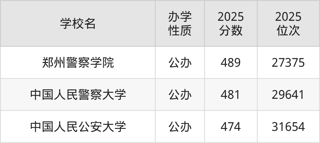 在一本招生的警务指挥与战术大学有3所,录取分数线最低的是中国人民公安大学,2025年最低分474分,位次是31654名。录取分数线最高的是郑州警察学院,2025年最低分489分。