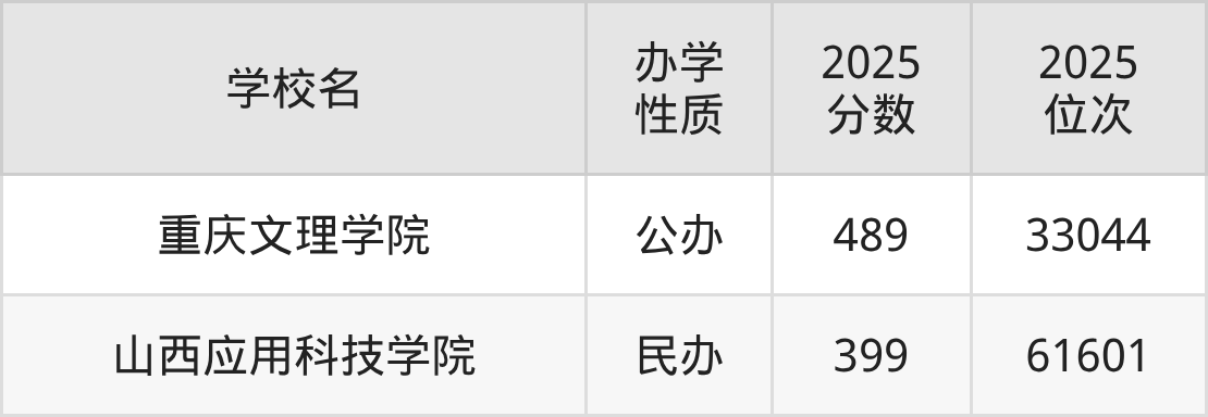在物理类二本招生的工程审计大学有2所,录取分数线最低的是山西应用科技学院,2025年最低分399分,位次是61601名。录取分数线最高的是重庆文理学院,2025年最低分489分。最低分公办二本工程审计大学为重庆文理学院,2025年最低分489分。