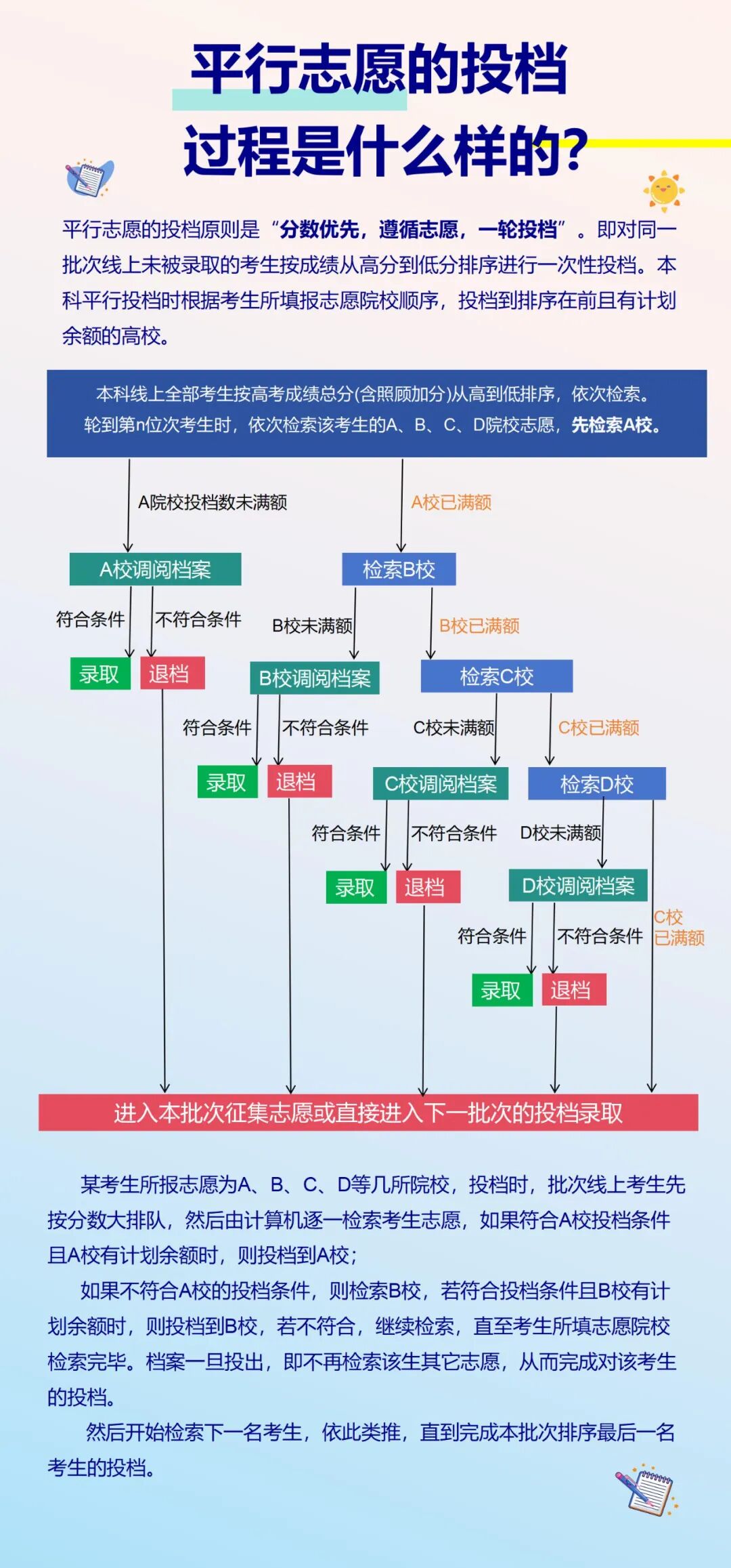 如果考生因为所有的平行志愿均未满足条件而未被投档导致滑档,或者投档后被院校退档,就只能参加征集志愿或下一批次录取。