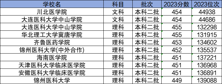 450分左右能上的医科大学有10所,其中文科只有2所,为川北医学院和大连医科大学中山学院,这2所大学的最低分都在454分,是目前考生位于450分左右唯一能够上的2所医科大学。