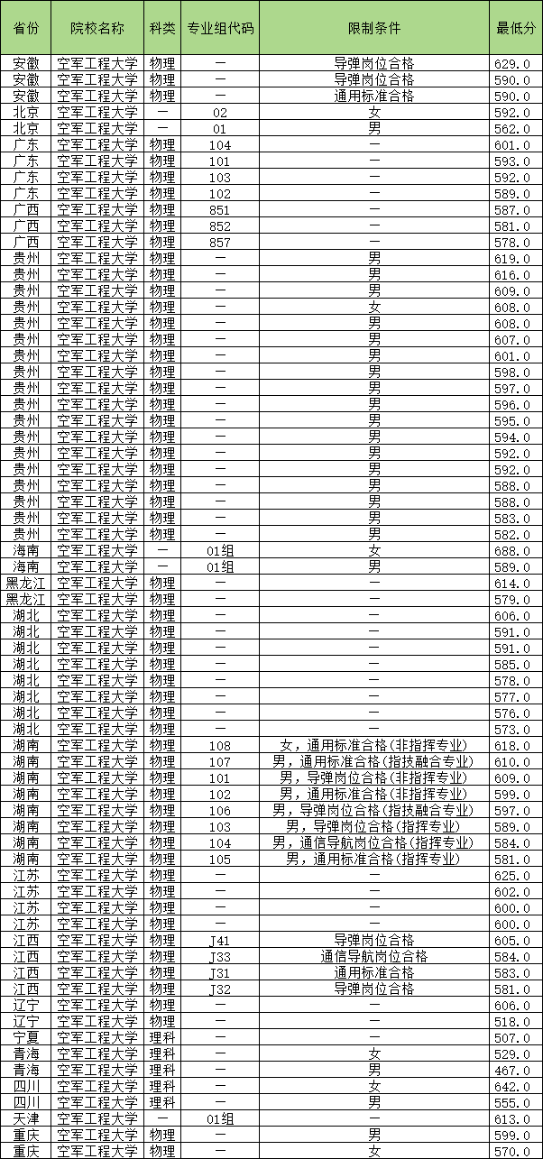 | 空军工程大学 | 物理 | 第101组(导弹岗位合格) | 男 | 606 |