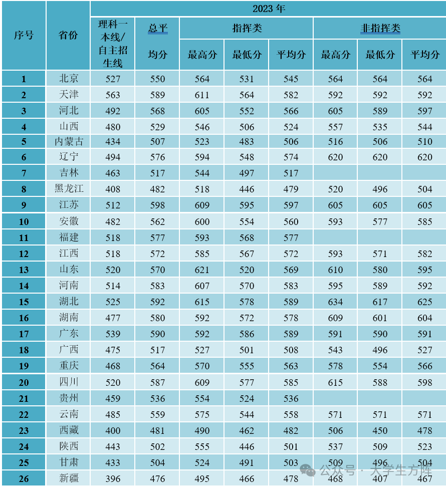 篇幅有限,以下是空军工程大学2023年在各省提前批招生录取最低分情况,供参考: