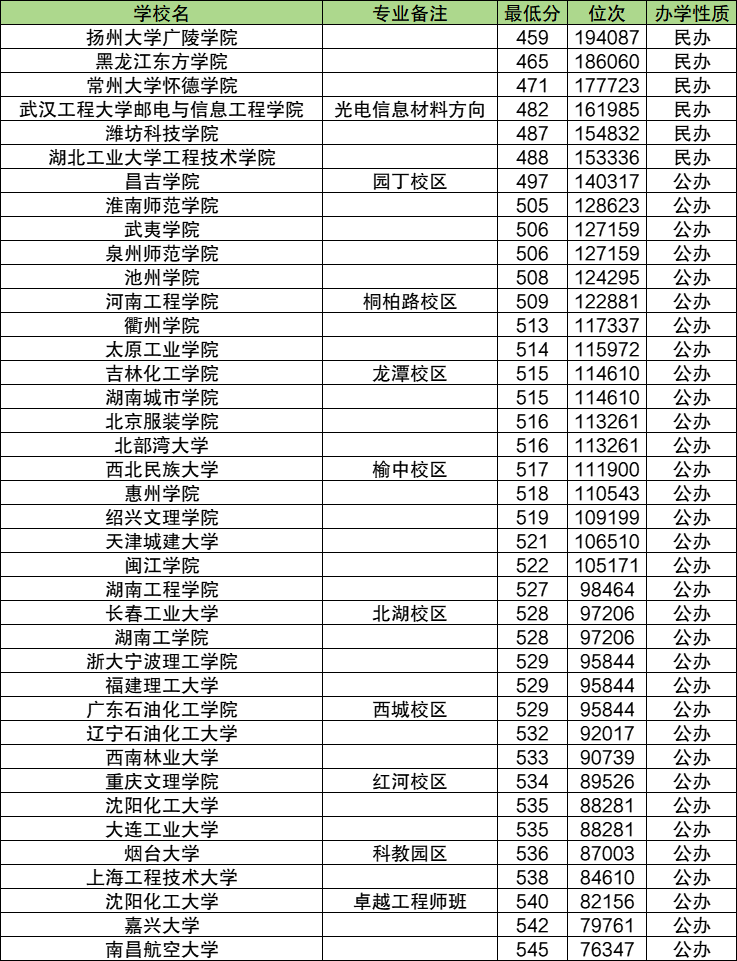 在理科二本招生的高分子材料与工程大学有38所,录取分数线最低的是扬州大学广陵学院(民办),2024年最低分459分;录取分数线最高的是南昌航空大学,2024年最低分545分。最低分公办二本高分子材料与工程大学为昌吉学院,2024年最低分497分。