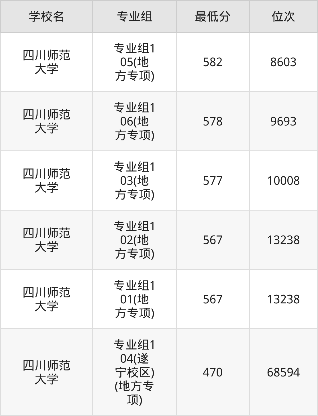 (1)四川师范大学:2025年地方专项计划分数线470分到582分,位次区间是68594名到8603名,招生专业组有6个,最低为专业组104(遂宁校区)(地方专项)、最高为专业组105(地方专项)。