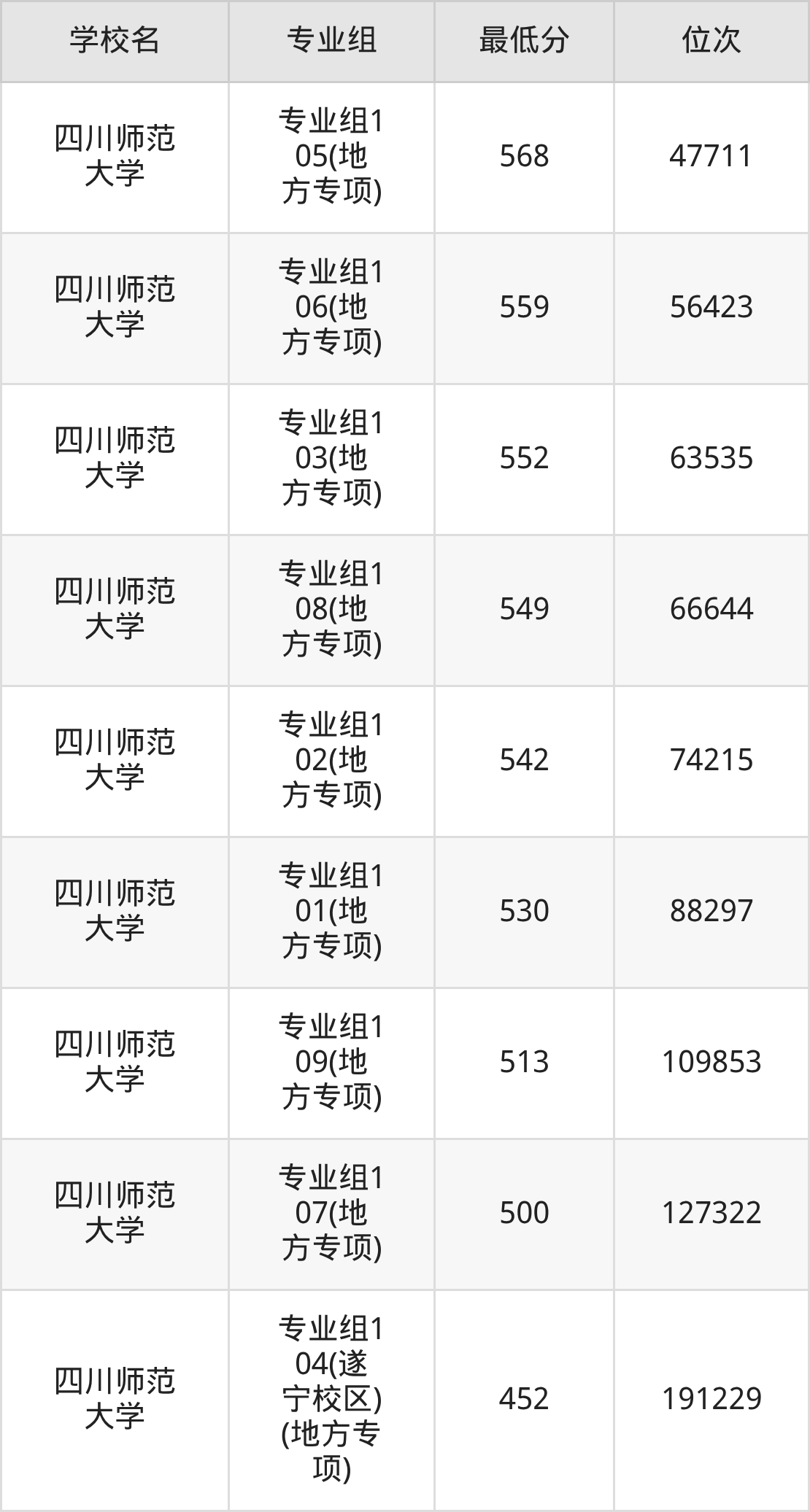 (1)四川师范大学:2025年地方专项计划分数线452分到568分,位次区间是191229名到47711名,招生专业组有9个,最低为专业组104(遂宁校区)(地方专项)、最高为专业组105(地方专项)。
