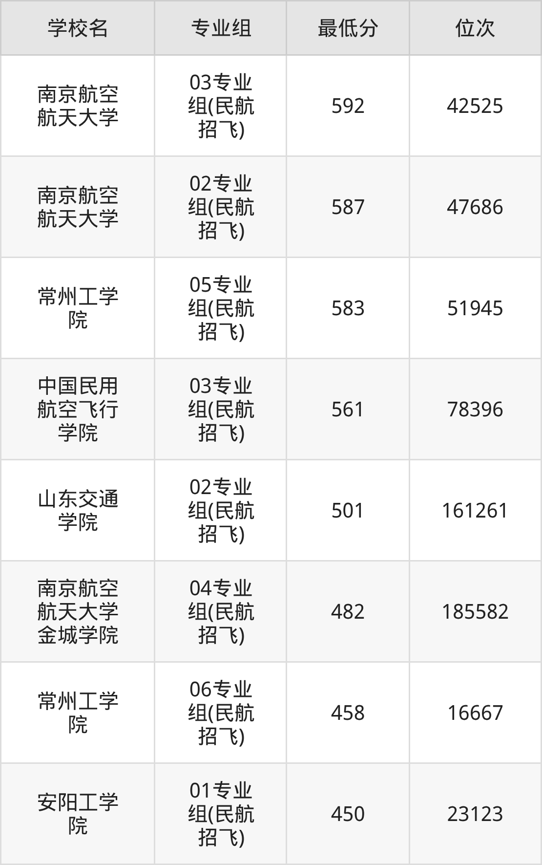 (3)南京航空航天大学金城学院:2025年民航招飞分数线482分,位次是185582名,招生专业组有1个,最低为04专业组(民航招飞)。