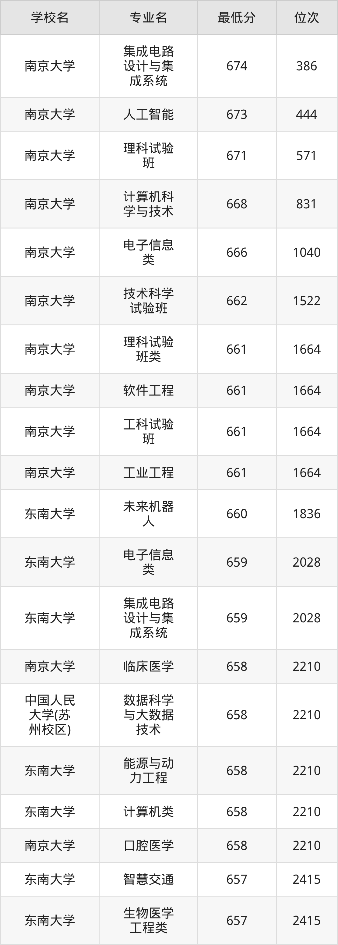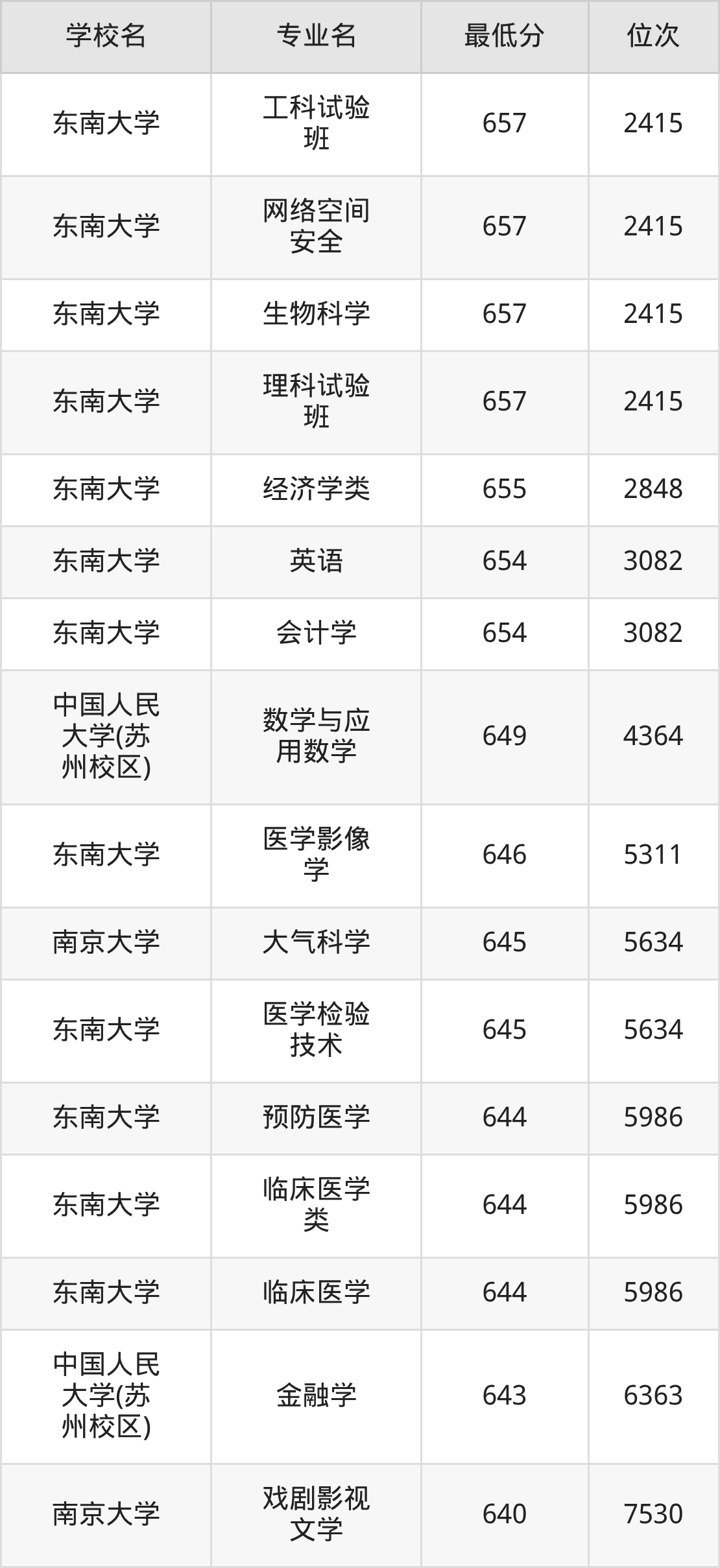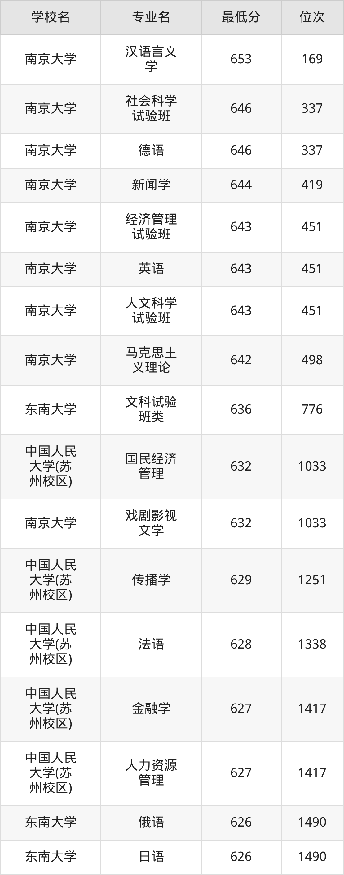 (3)东南大学:2025年985分数线626分到636分,位次区间是1490名到776名,招生专业有3个,最低为俄语、日语、最高为文科试验班类。