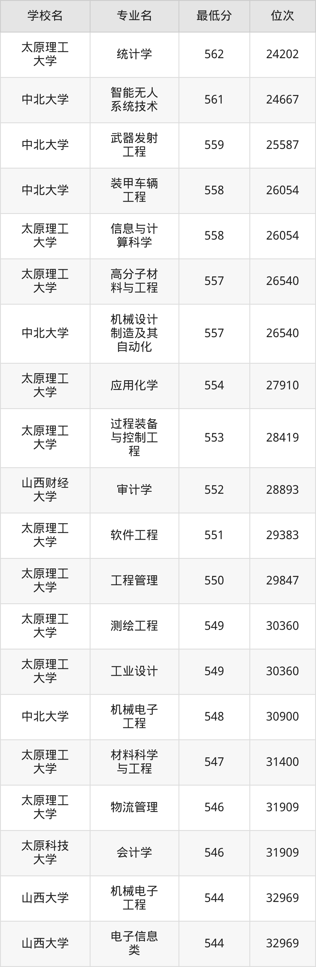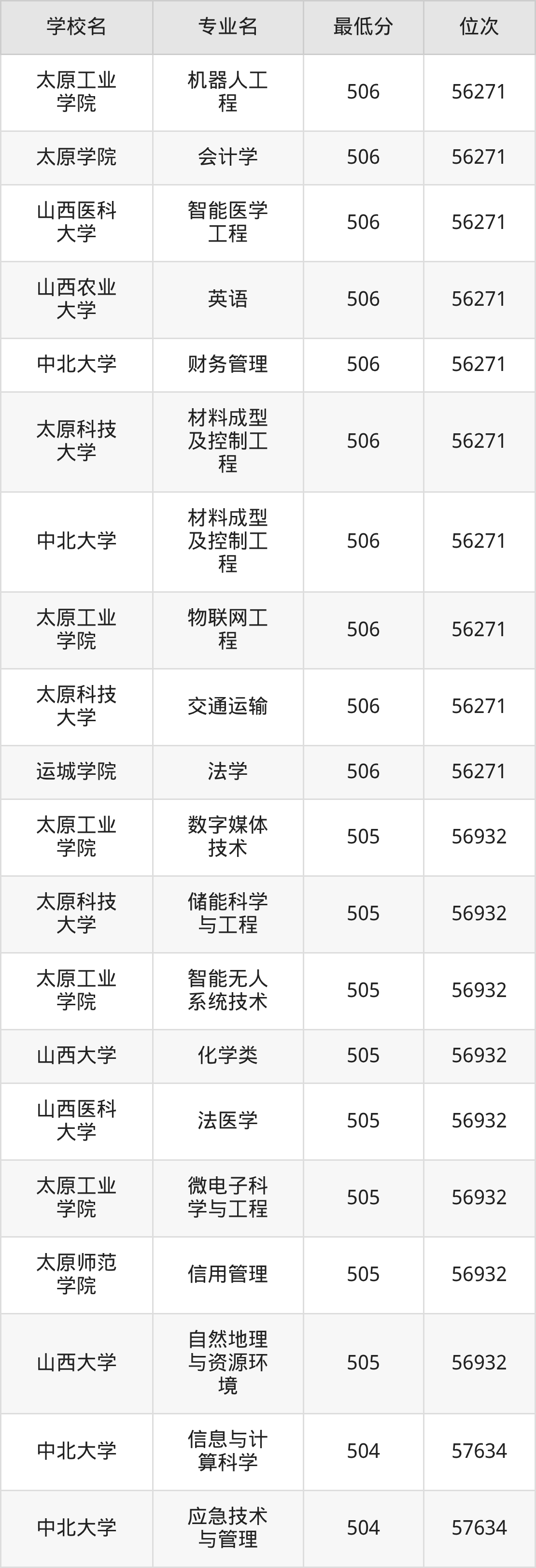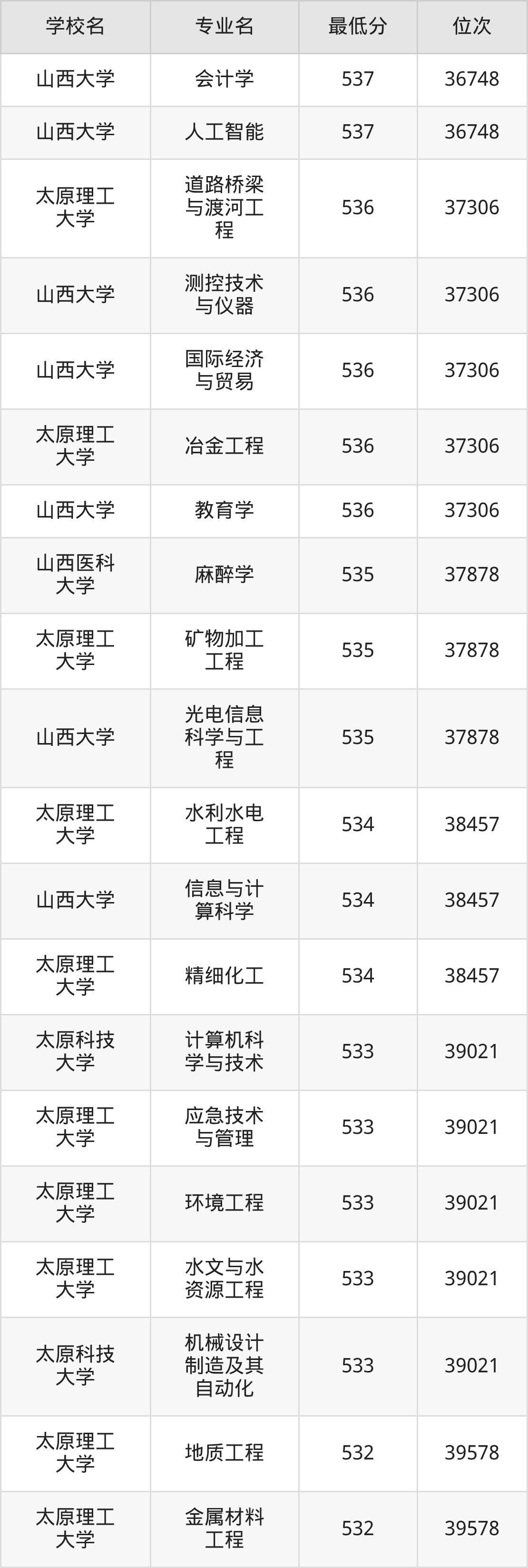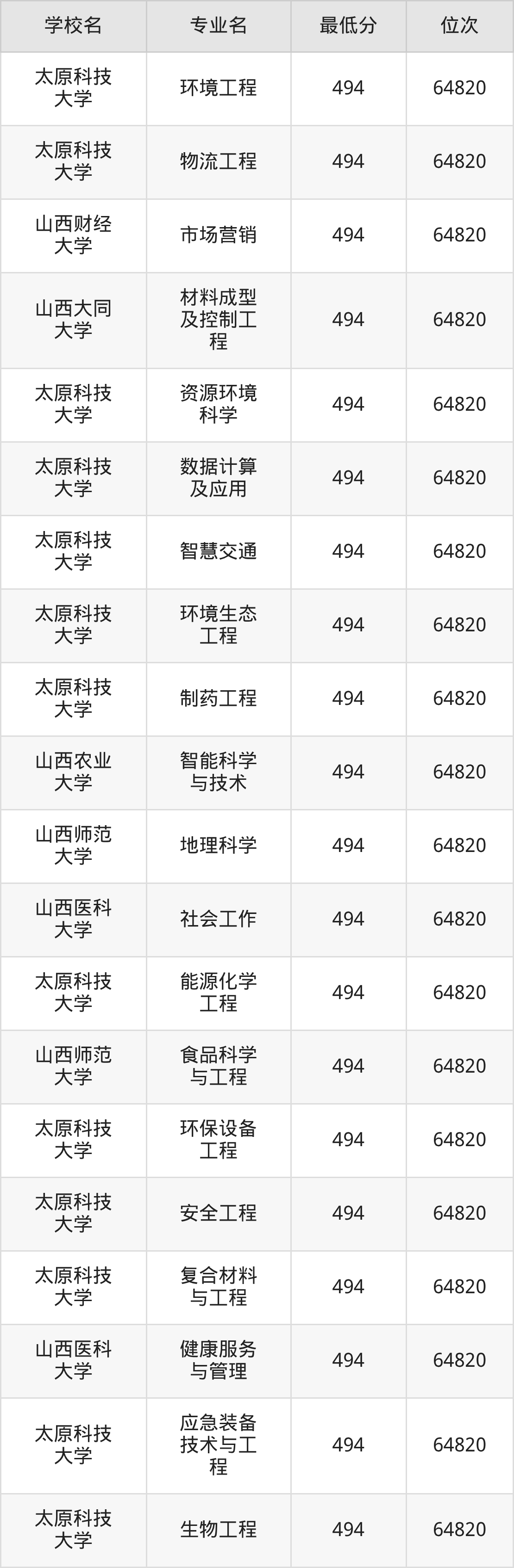 (6)太原科技大学:2025年公办本科分数线494分到546分,位次区间是64820名到31909名,招生专业有55个,最低为环境工程、物流工程、资源环境科学、数据计算及应用、智慧交通、环境生态工程、制药工程、能源化学工程、环保设备工程、安全工程、复合材料与工程、应急装备技术与工程、生物工程、最高为会计学。