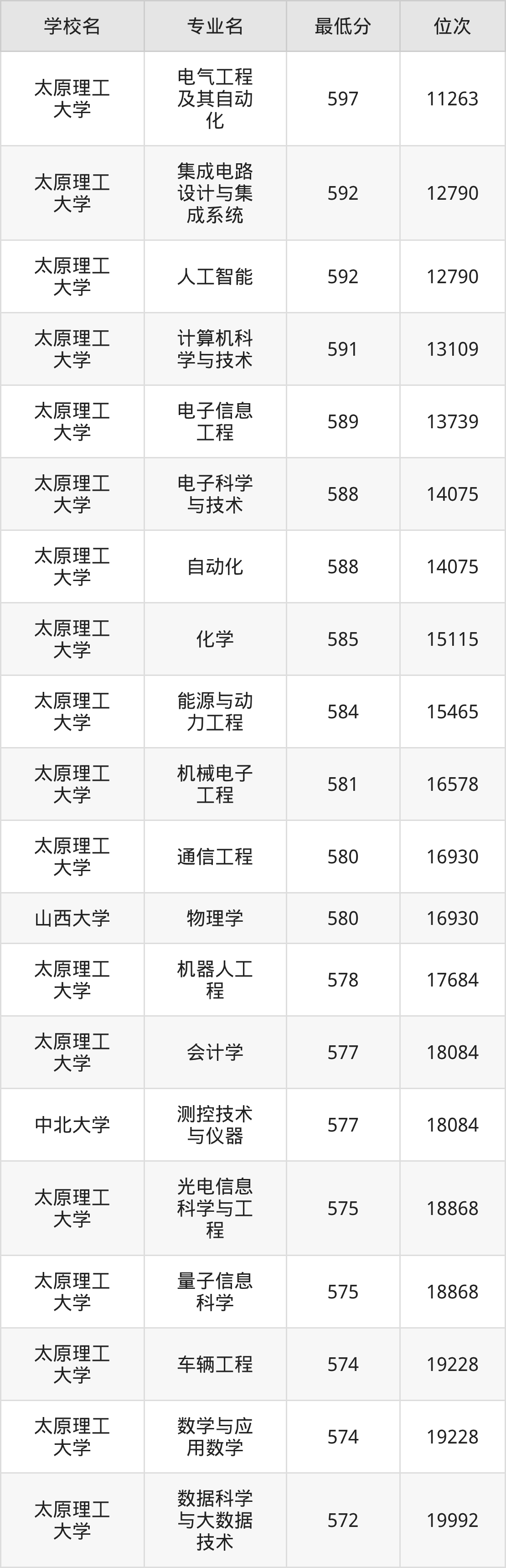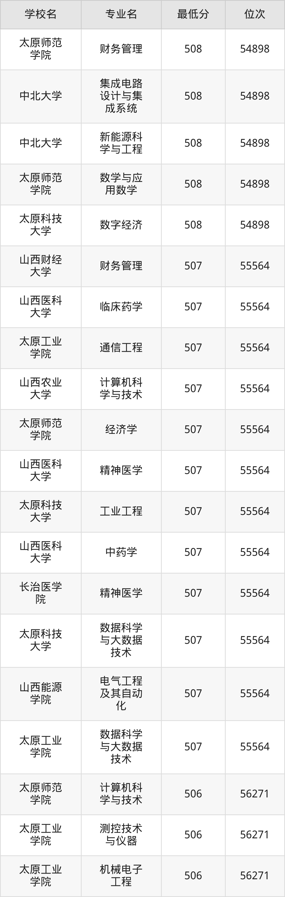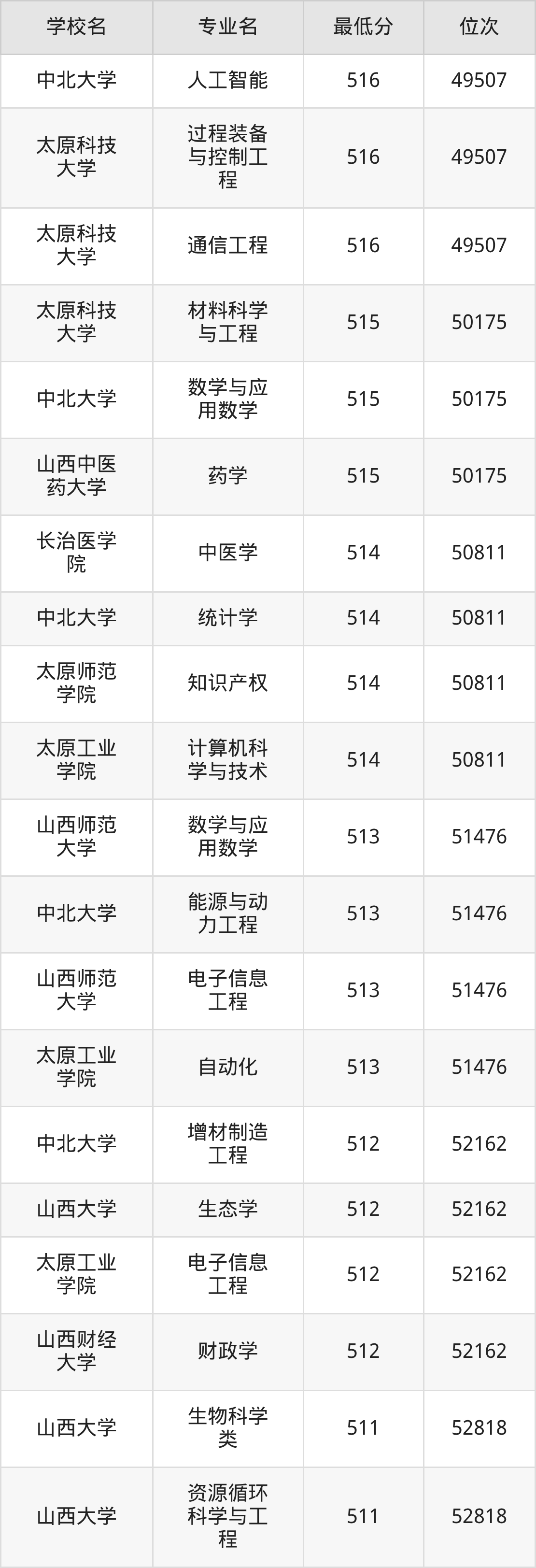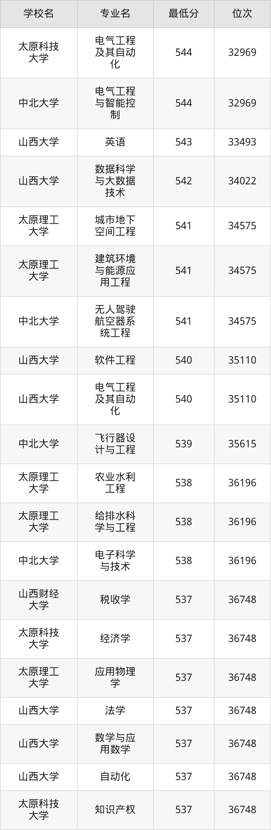 (6)太原科技大学:2025年公办本科分数线494分到546分,位次区间是64820名到31909名,招生专业有55个,最低为环境工程、物流工程、资源环境科学、数据计算及应用、智慧交通、环境生态工程、制药工程、能源化学工程、环保设备工程、安全工程、复合材料与工程、应急装备技术与工程、生物工程、最高为会计学。