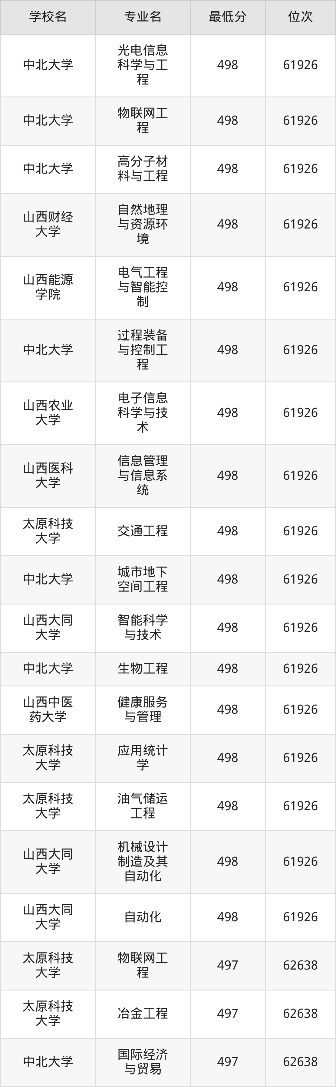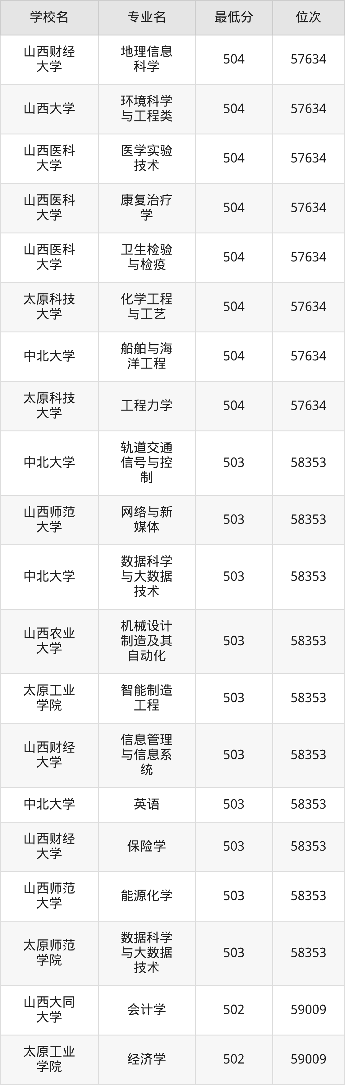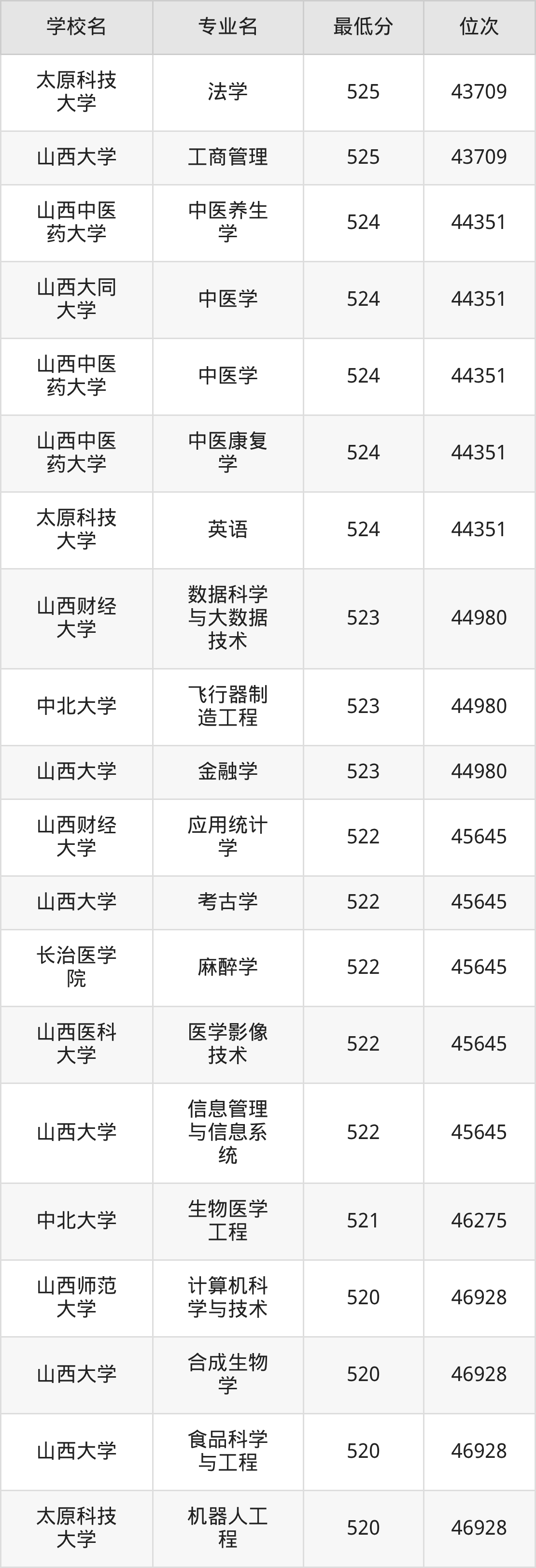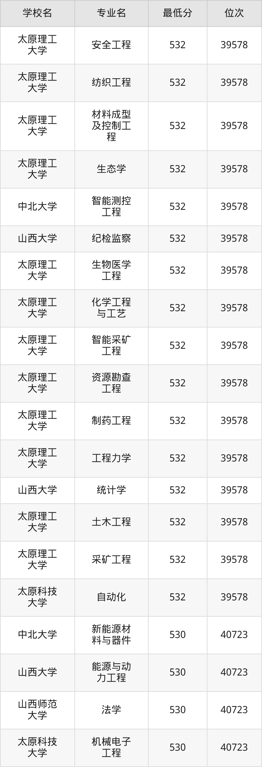 (6)太原科技大学:2025年公办本科分数线494分到546分,位次区间是64820名到31909名,招生专业有55个,最低为环境工程、物流工程、资源环境科学、数据计算及应用、智慧交通、环境生态工程、制药工程、能源化学工程、环保设备工程、安全工程、复合材料与工程、应急装备技术与工程、生物工程、最高为会计学。