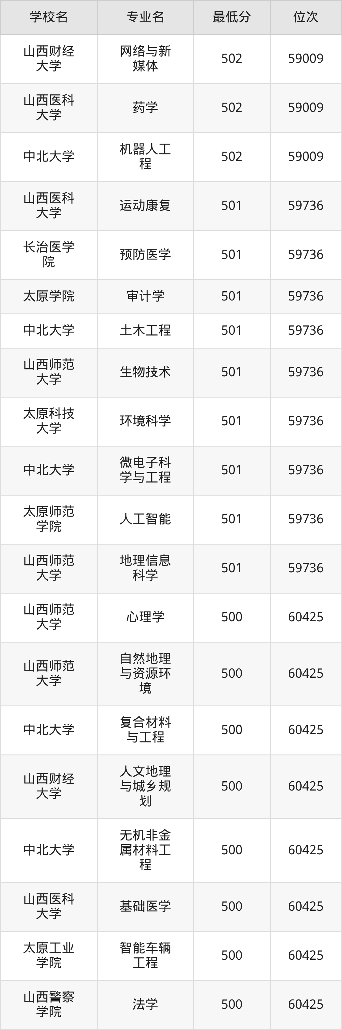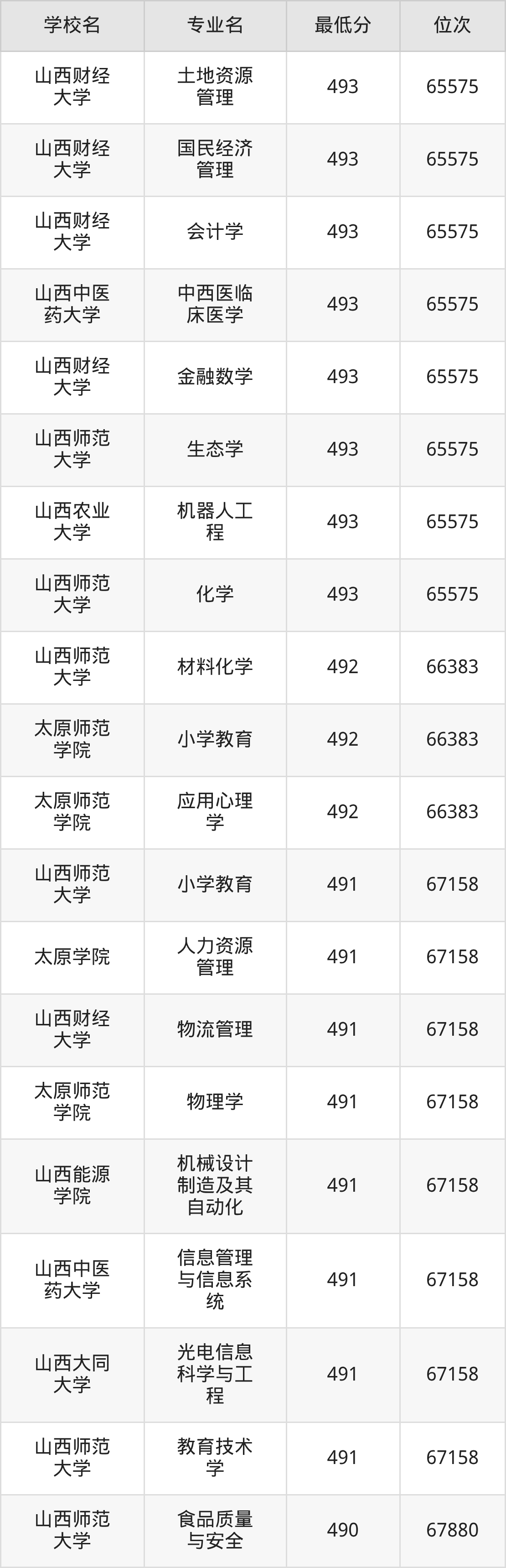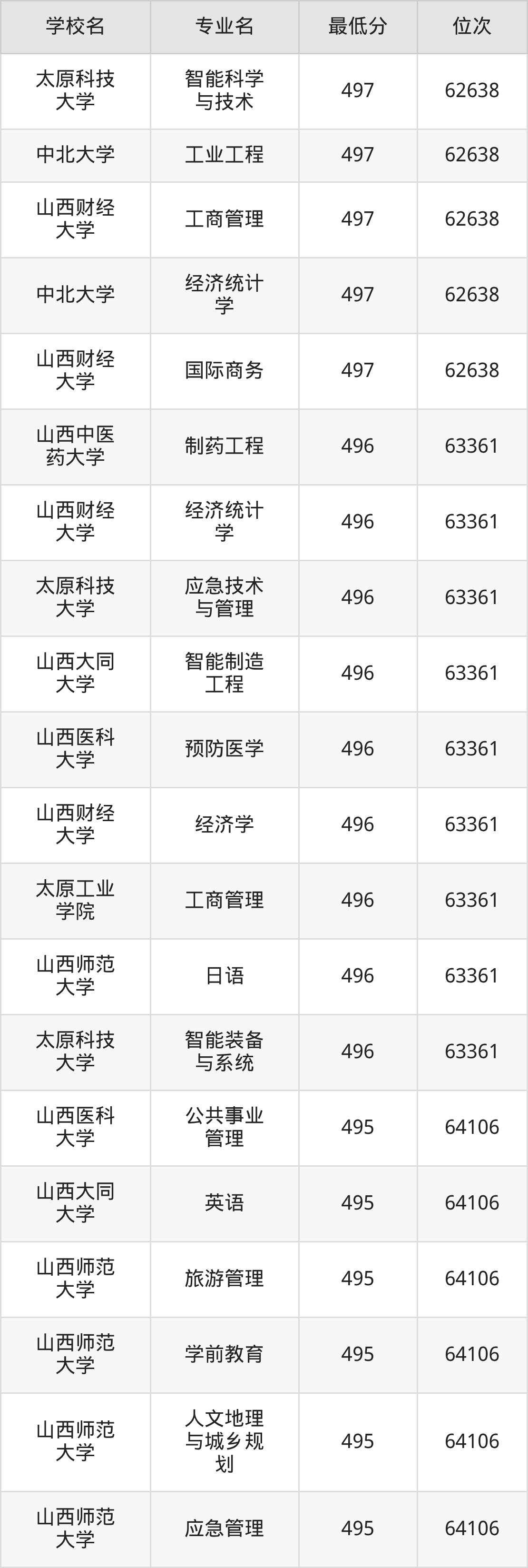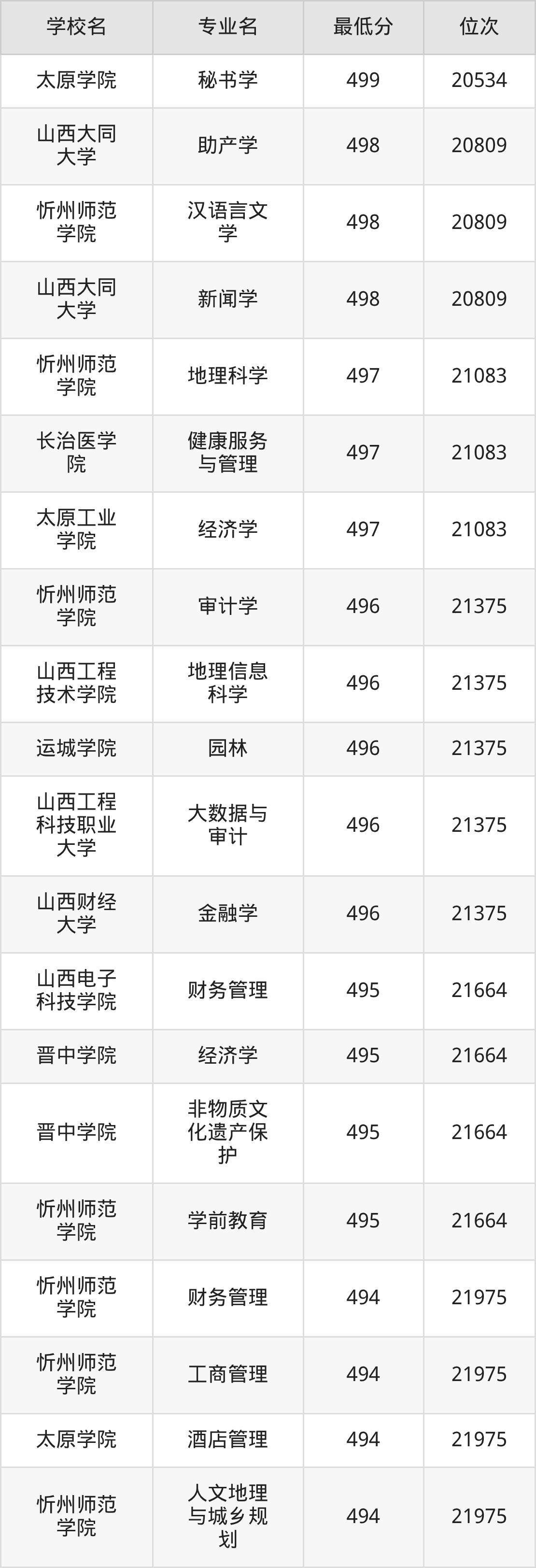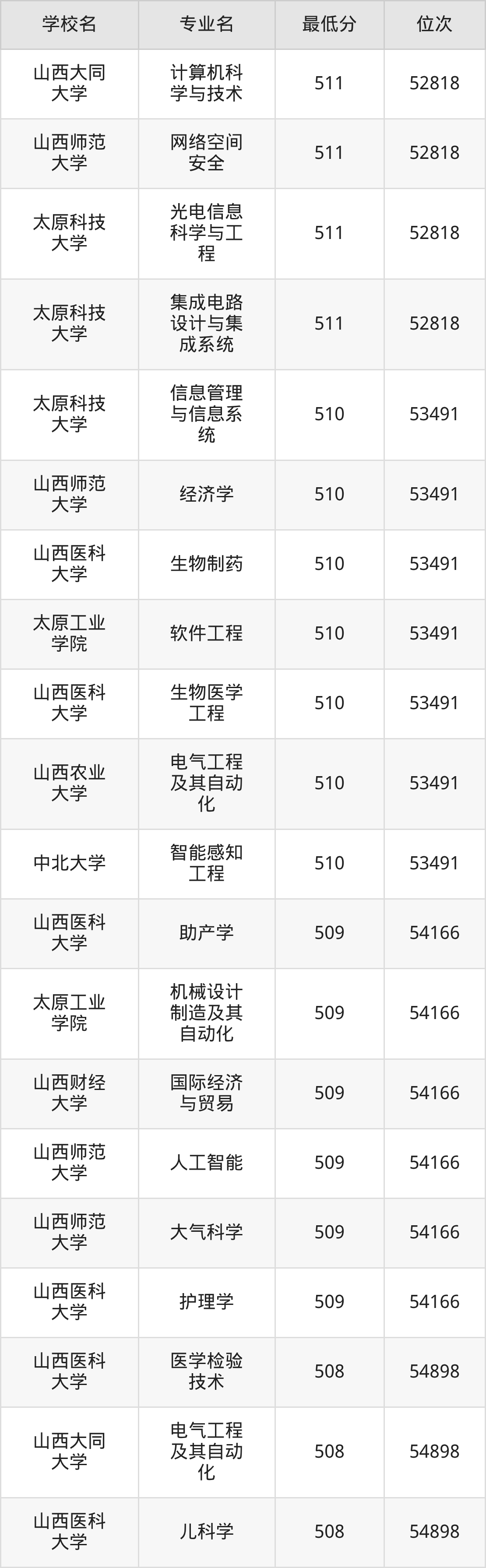 (4)山西财经大学:2025年公办本科分数线496分到545分,位次区间是21375名到9377名,招生专业有28个,最低为金融学、最高为审计学。