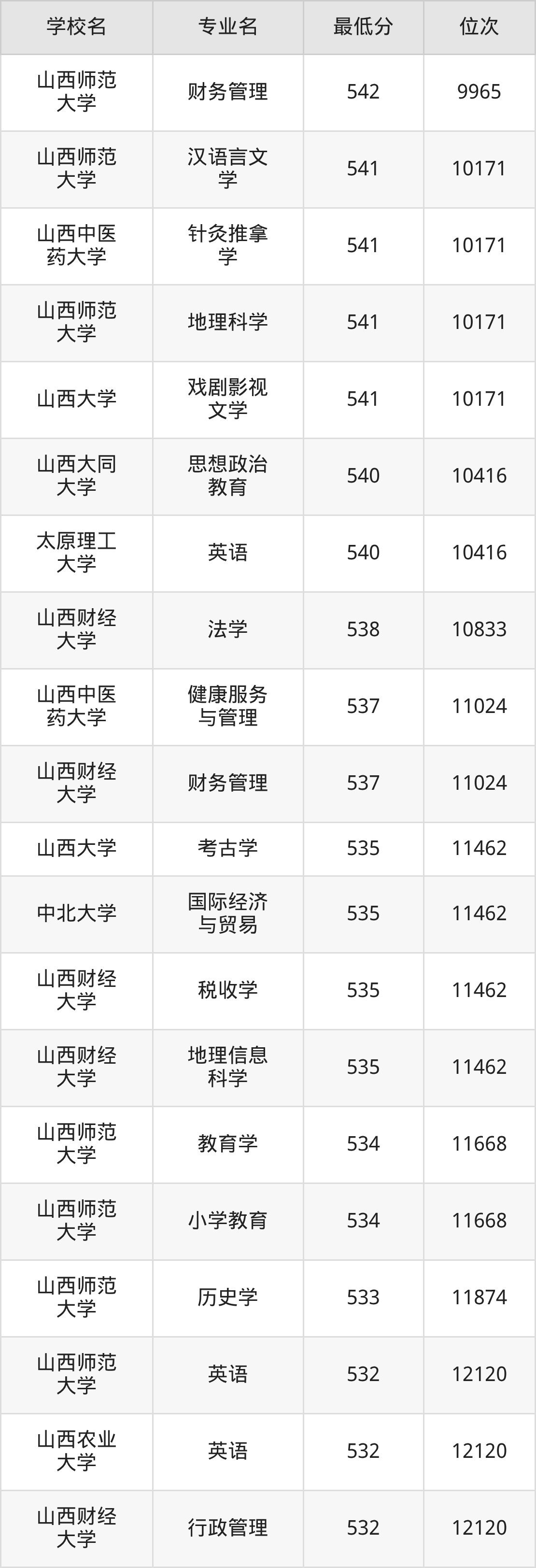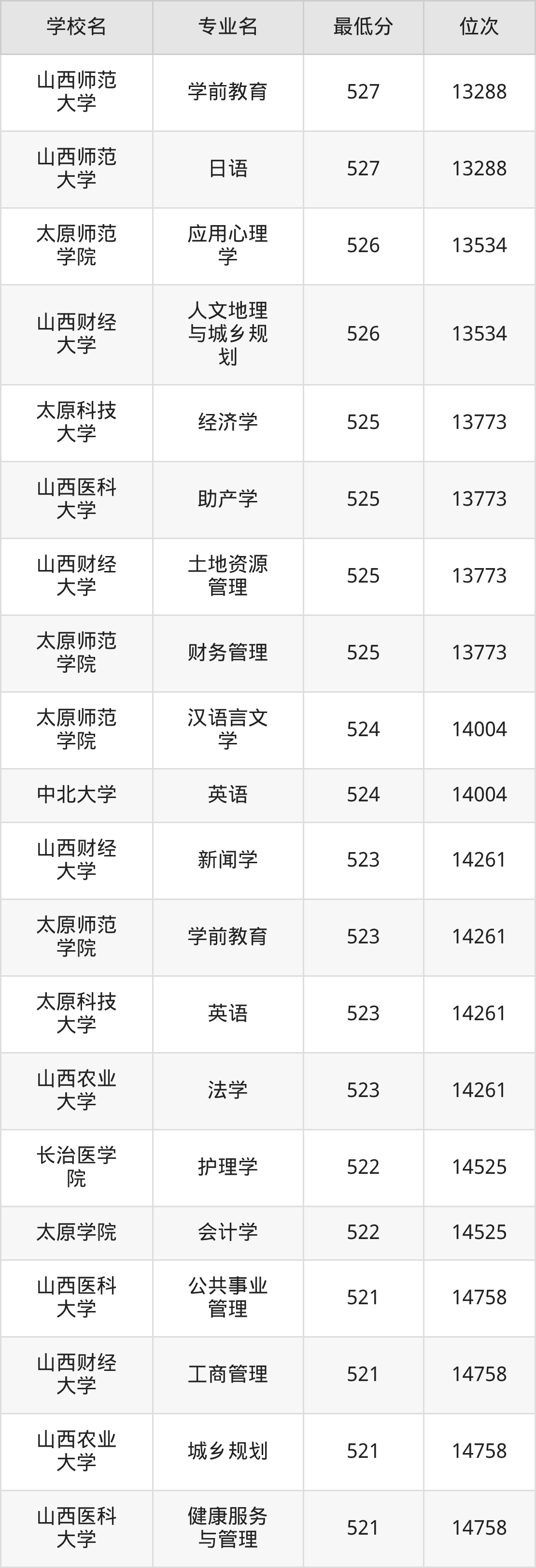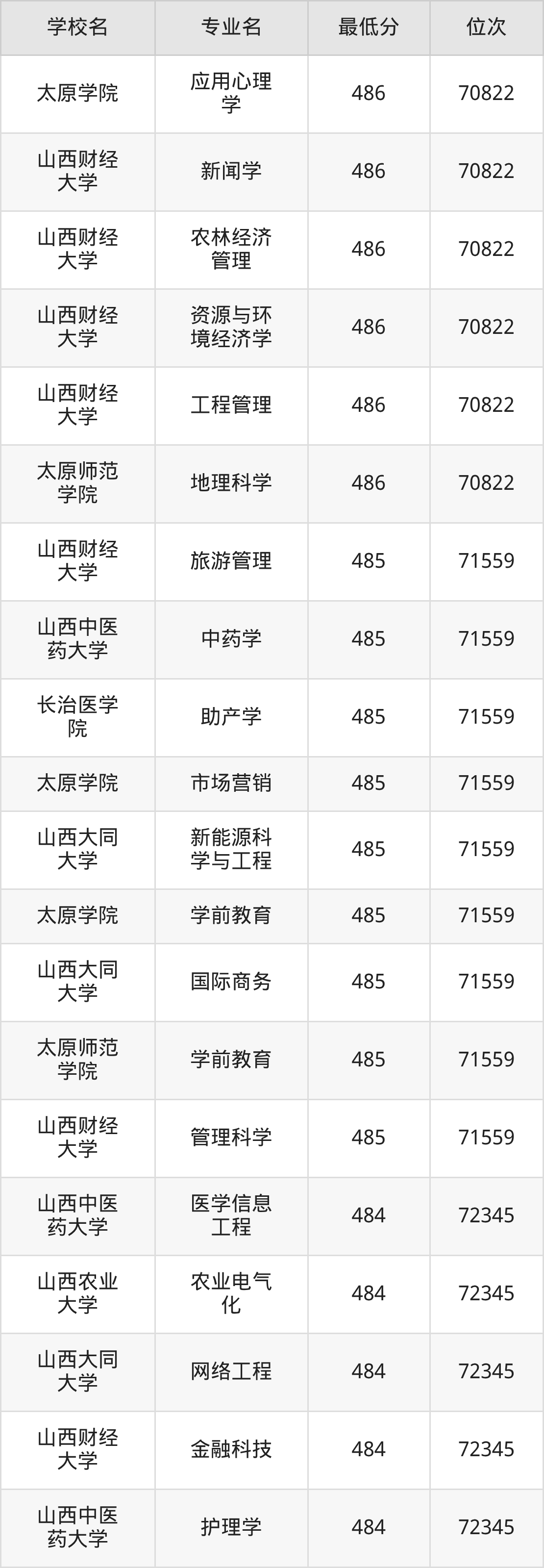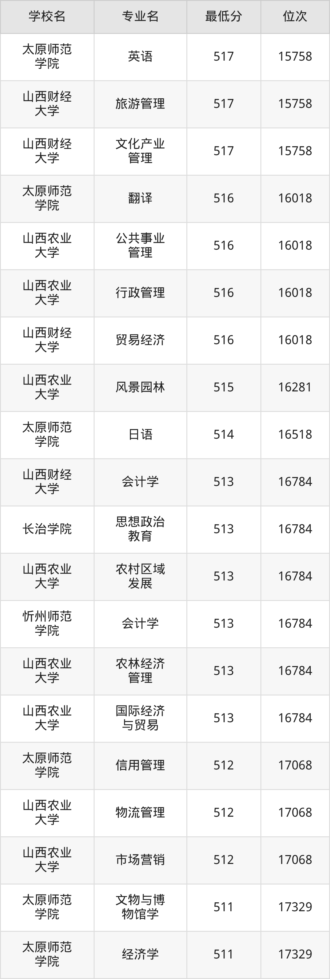 (4)山西财经大学:2025年公办本科分数线496分到545分,位次区间是21375名到9377名,招生专业有28个,最低为金融学、最高为审计学。