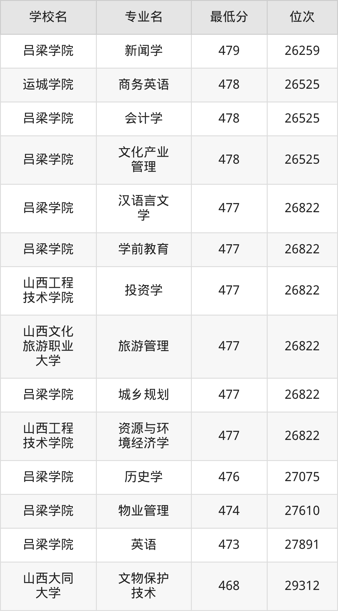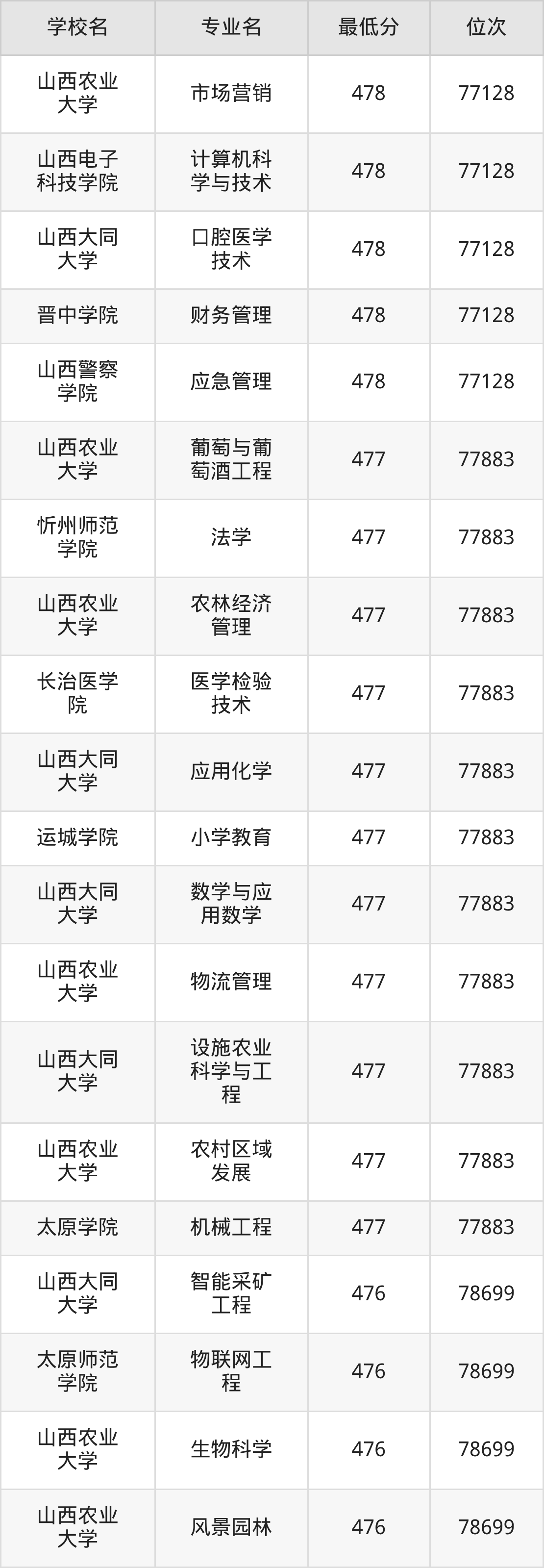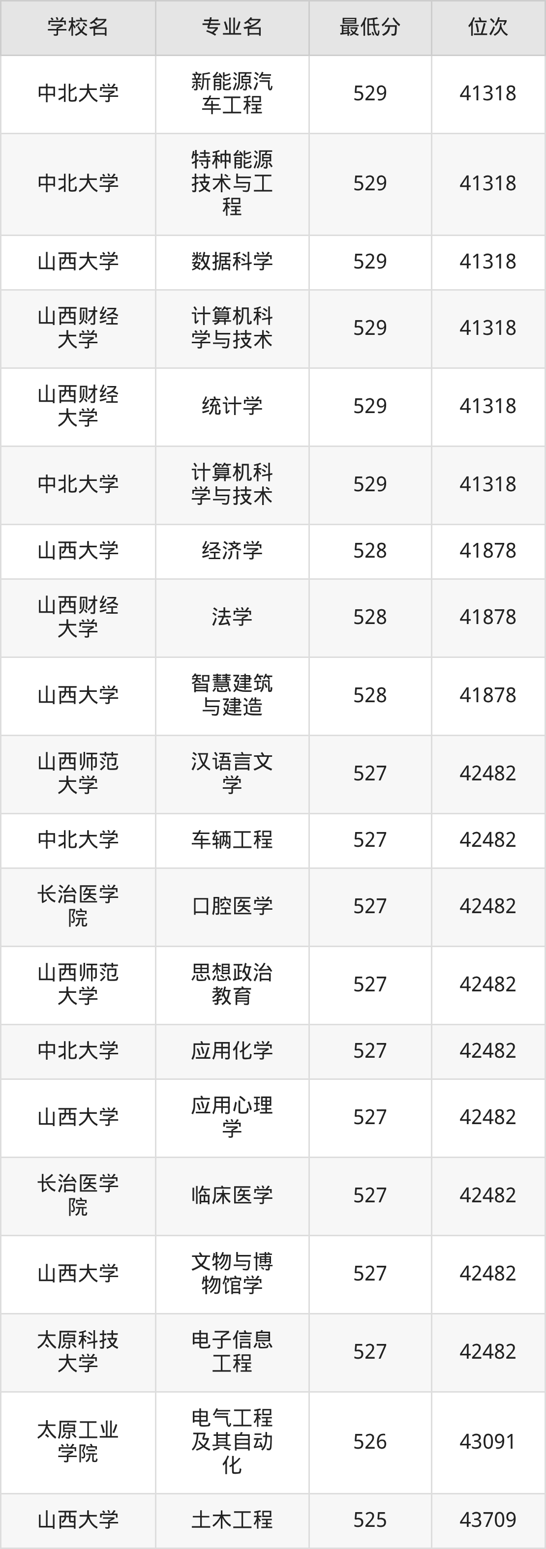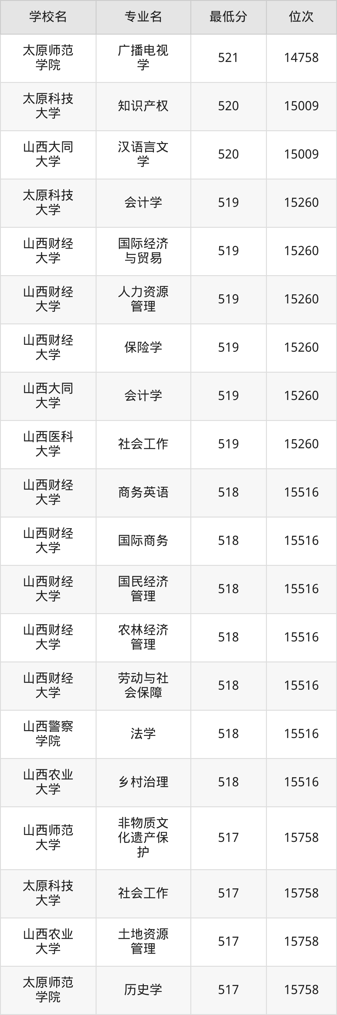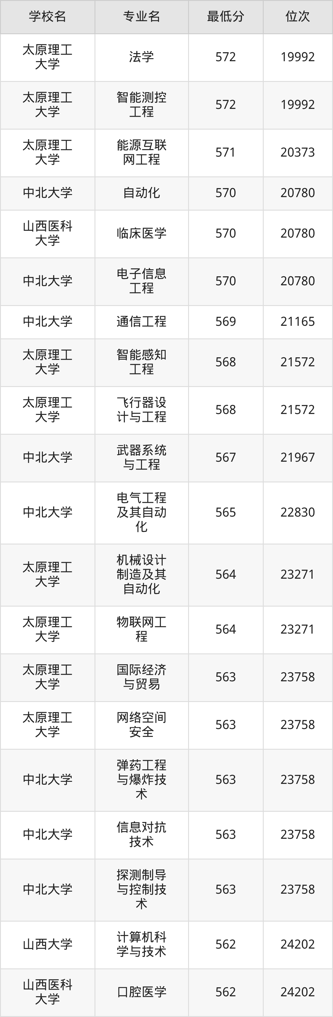 (4)山西财经大学:2025年公办本科分数线496分到545分,位次区间是21375名到9377名,招生专业有28个,最低为金融学、最高为审计学。