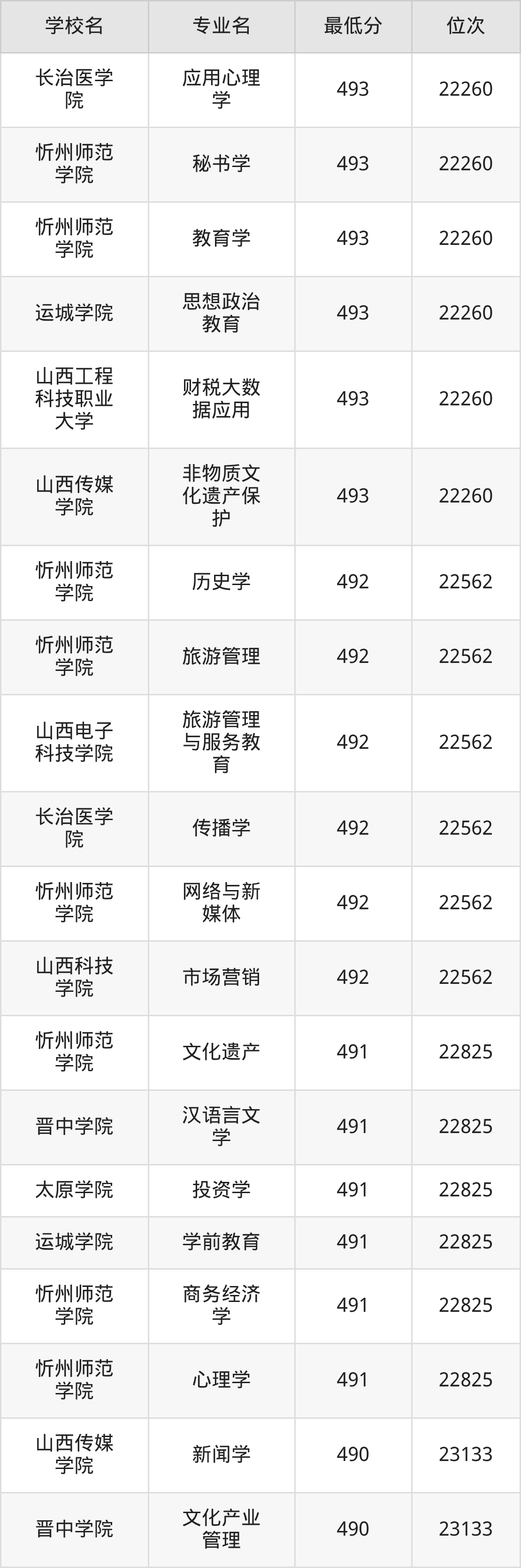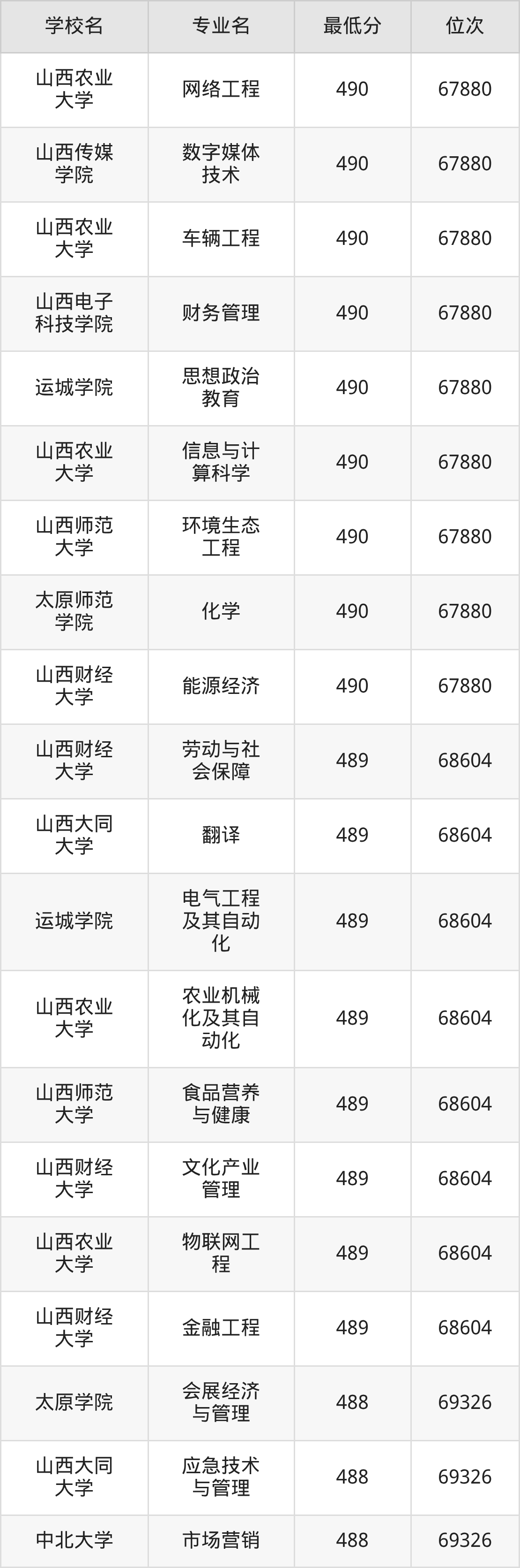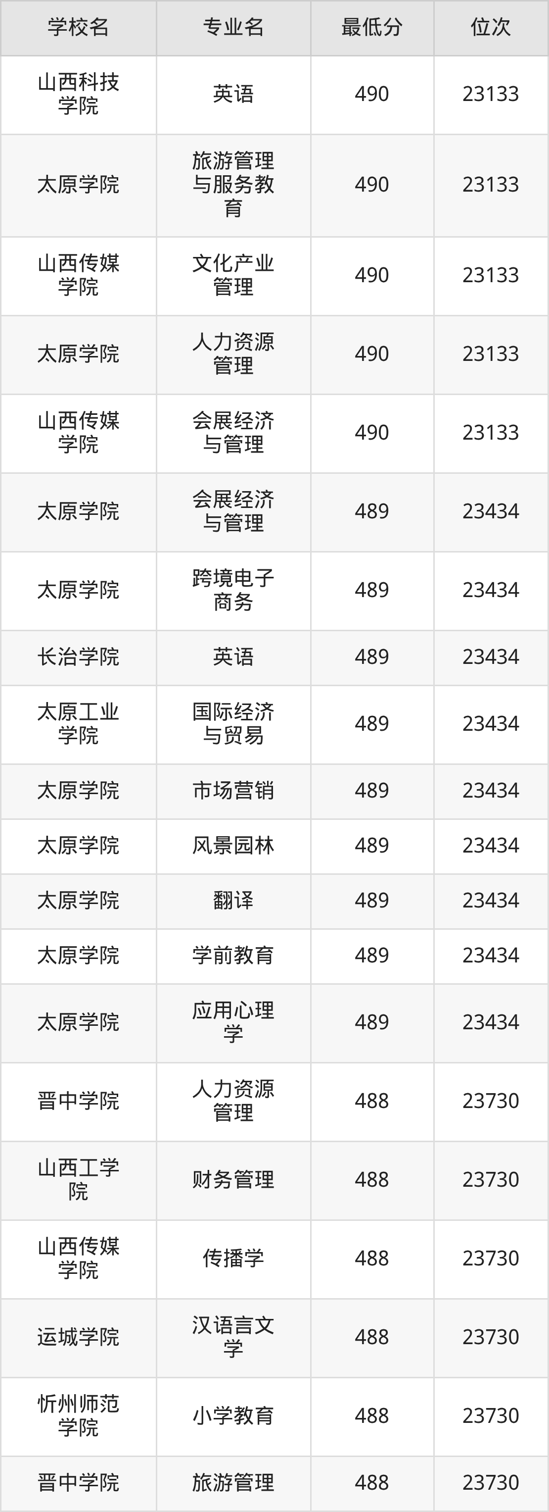 (1)山西科技学院:2025年公办本科分数线490分到506分,位次区间是23133名到18627名,招生专业有4个,最低为英语、最高为会计学。