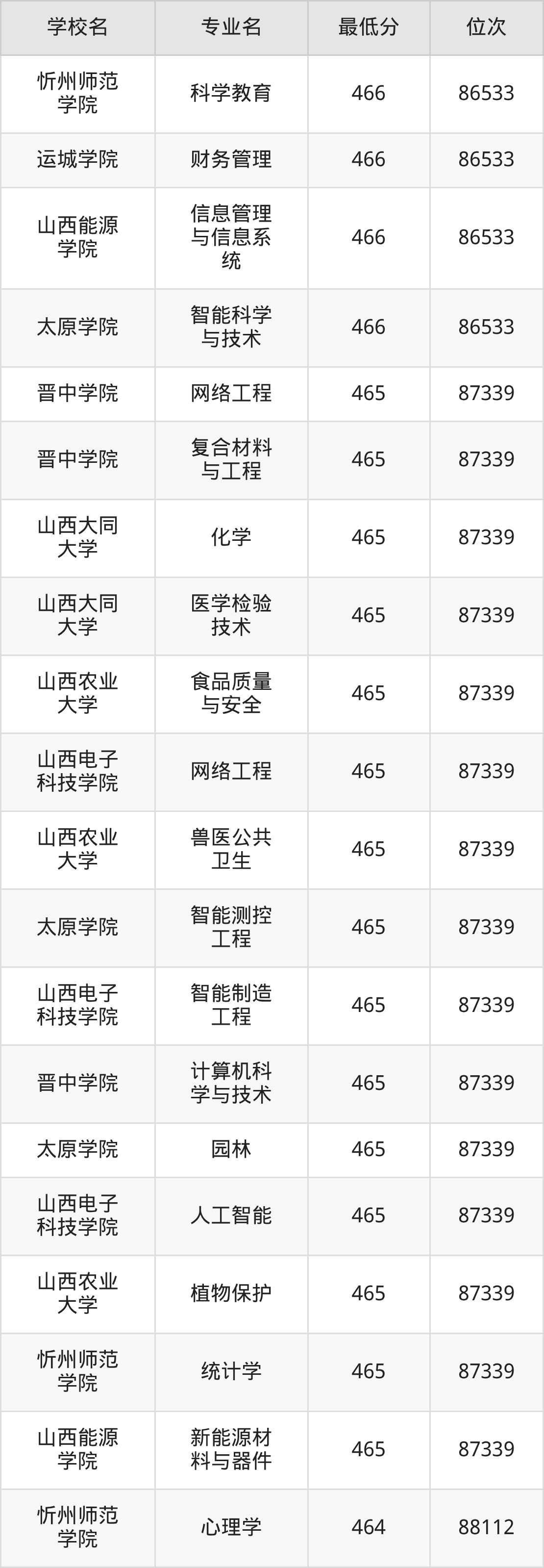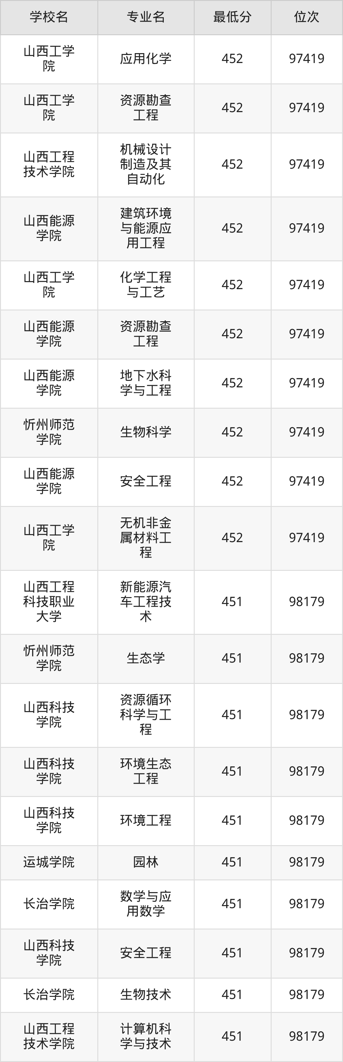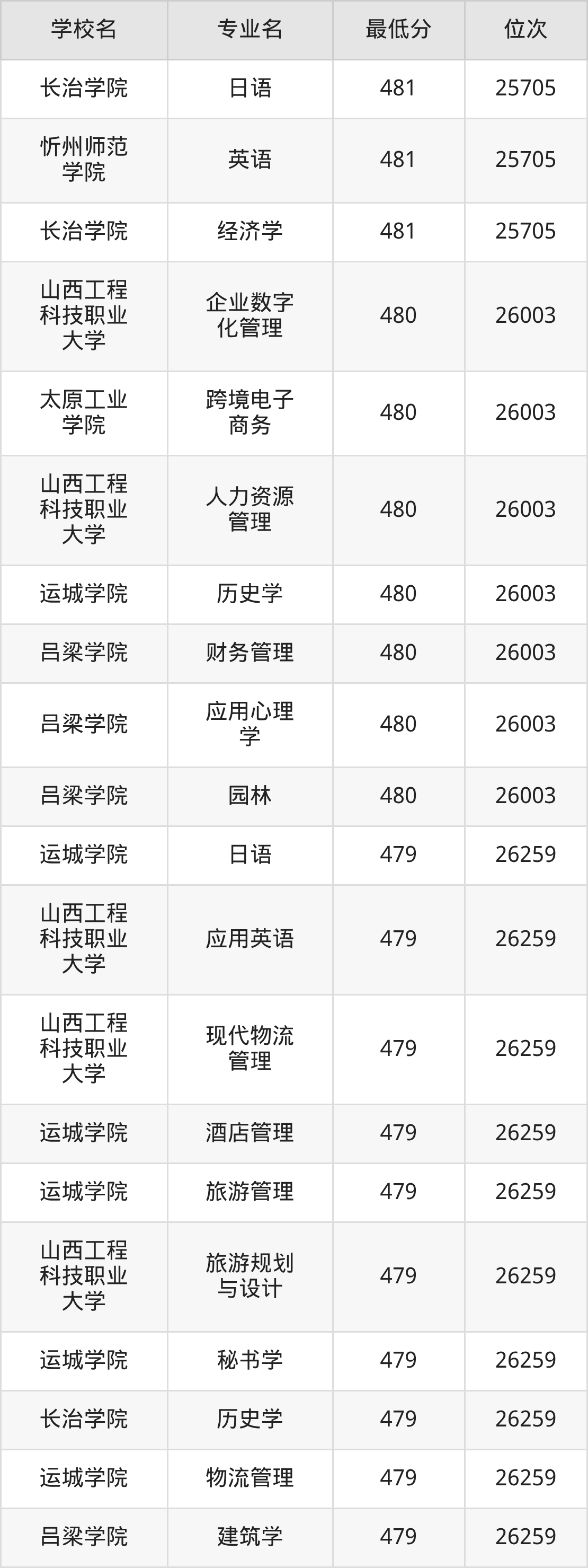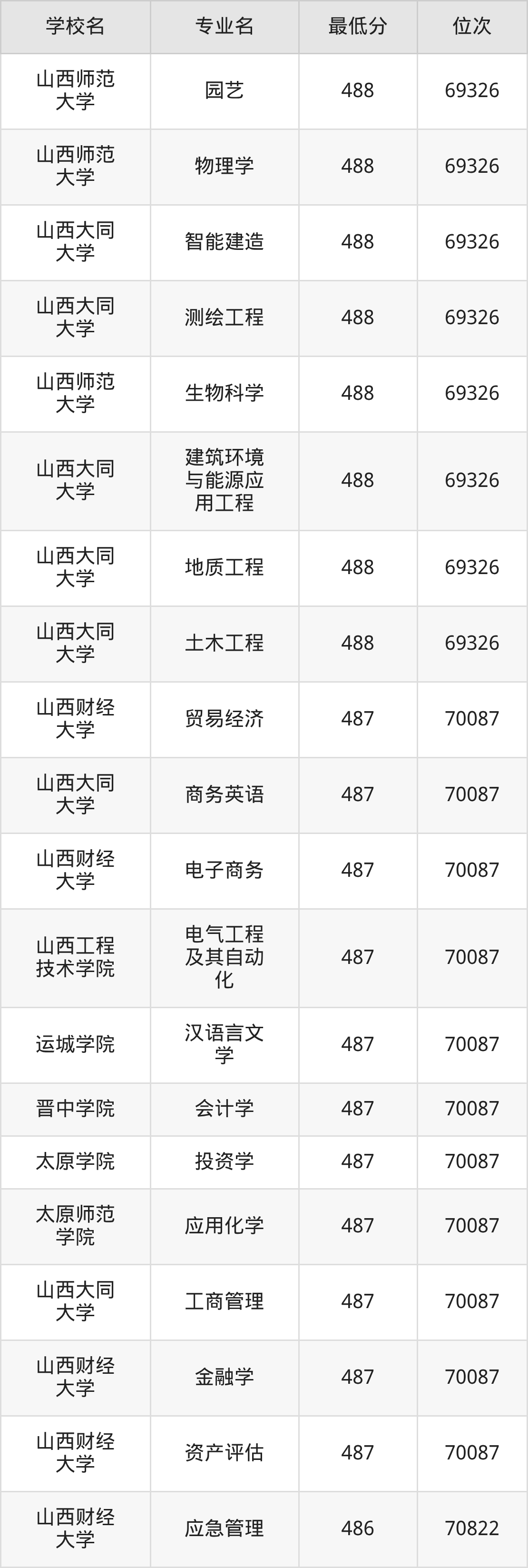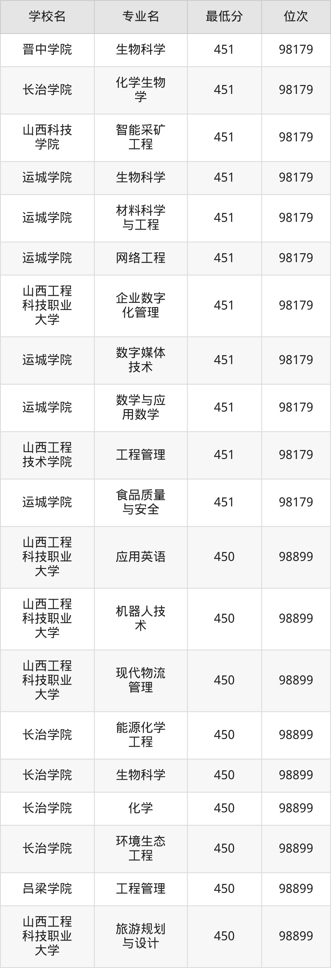 (2)晋中学院:2025年公办本科分数线451分到487分,位次区间是98179名到70087名,招生专业有31个,最低为生物科学、最高为会计学。