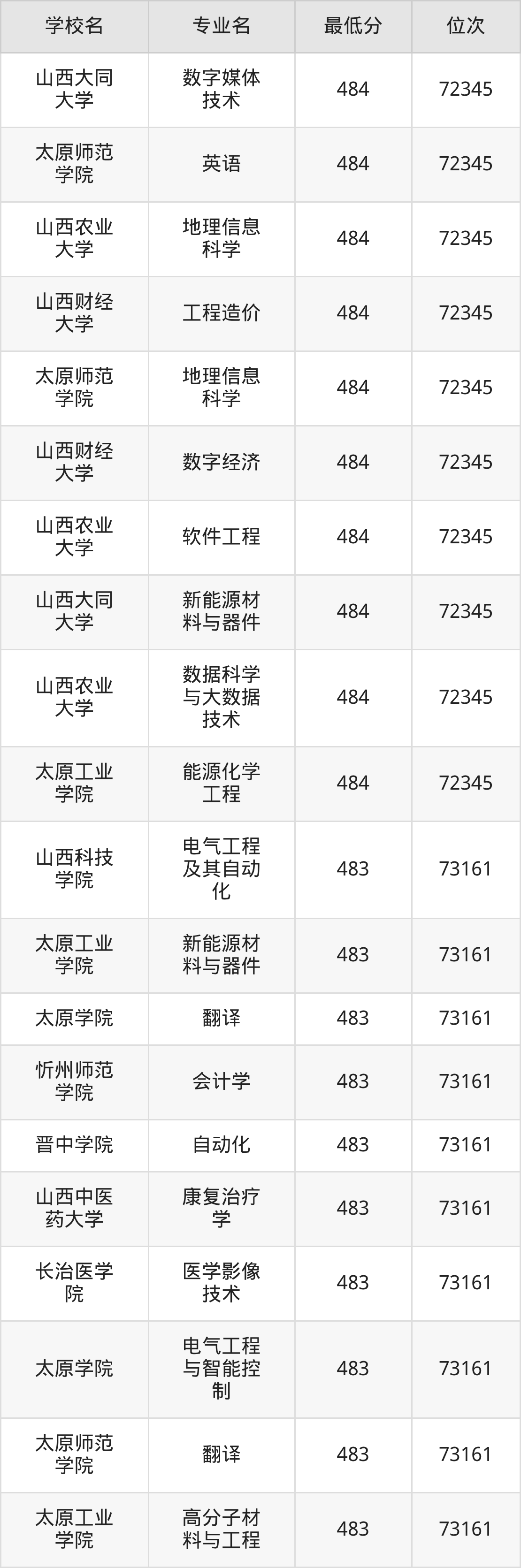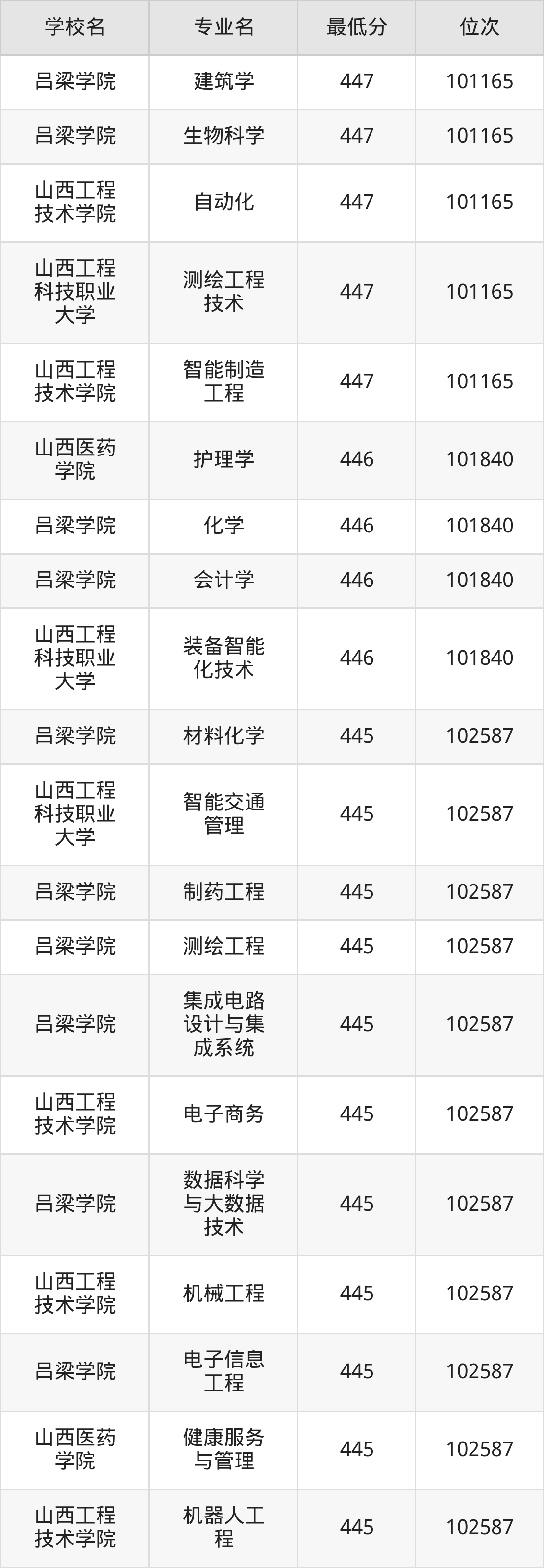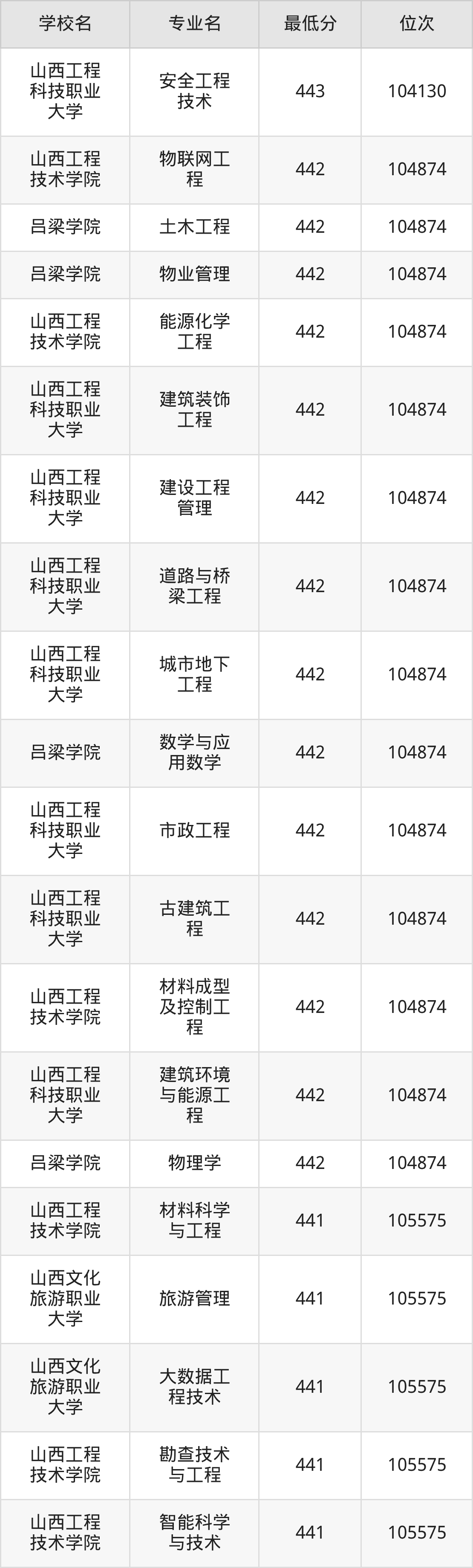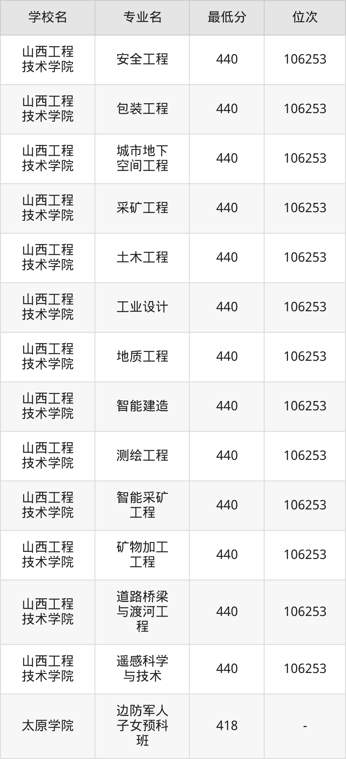 (1)山西工程技术学院:2025年公办本科分数线440分到487分,位次区间是106253名到70087名,招生专业有33个,最低为安全工程、包装工程、城市地下空间工程、采矿工程、土木工程、工业设计、地质工程、智能建造、测绘工程、智能采矿工程、矿物加工工程、道路桥梁与渡河工程、遥感科学与技术、最高为电气工程及其自动化。