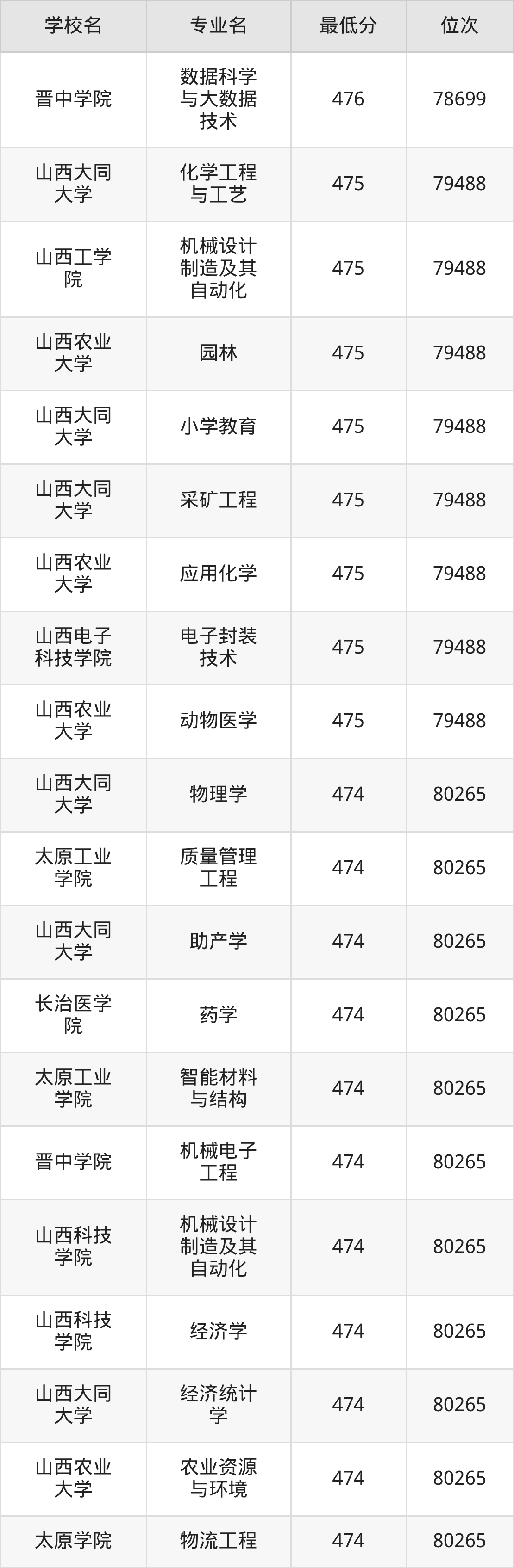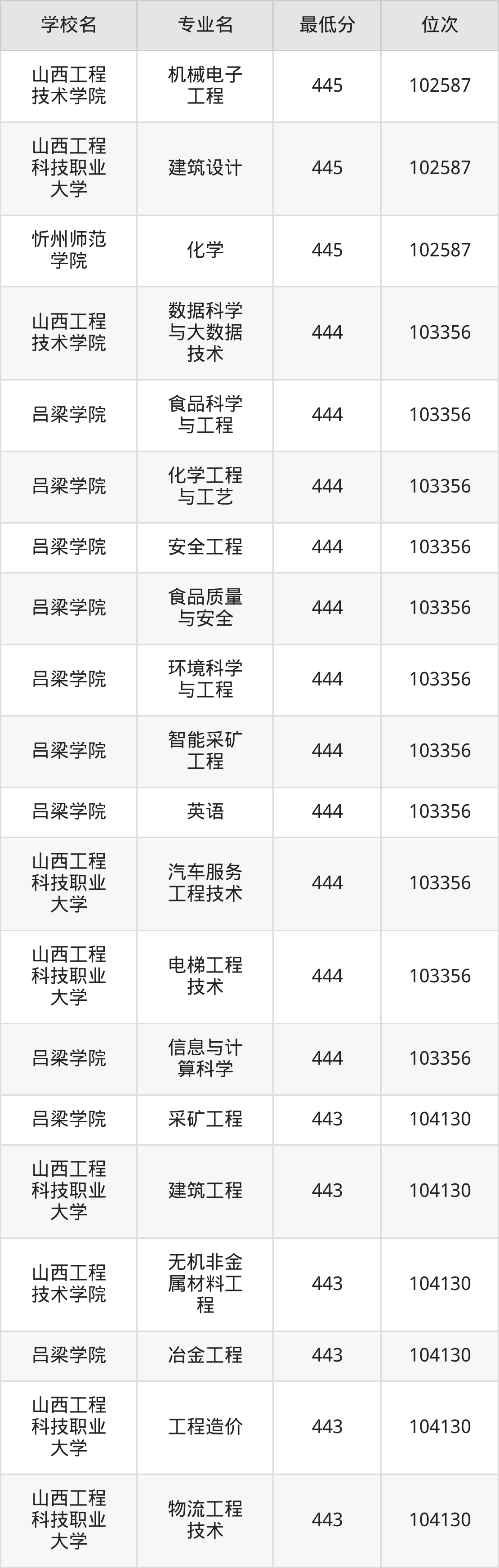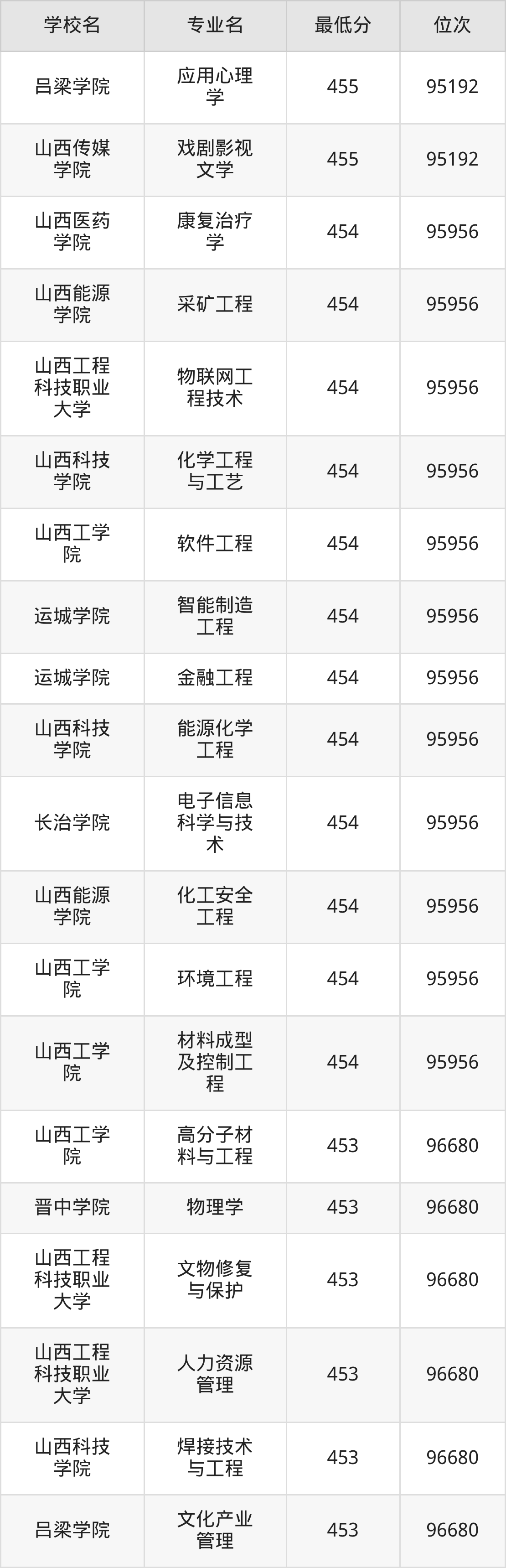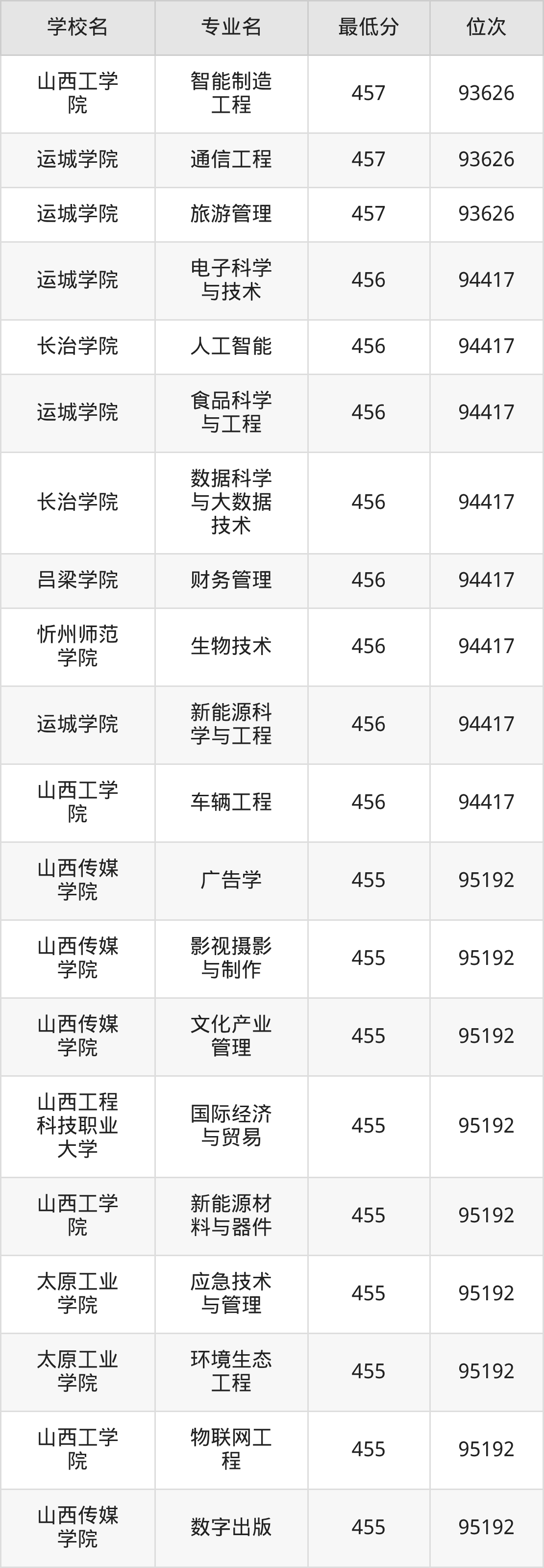 (1)山西工程技术学院:2025年公办本科分数线440分到487分,位次区间是106253名到70087名,招生专业有33个,最低为安全工程、包装工程、城市地下空间工程、采矿工程、土木工程、工业设计、地质工程、智能建造、测绘工程、智能采矿工程、矿物加工工程、道路桥梁与渡河工程、遥感科学与技术、最高为电气工程及其自动化。